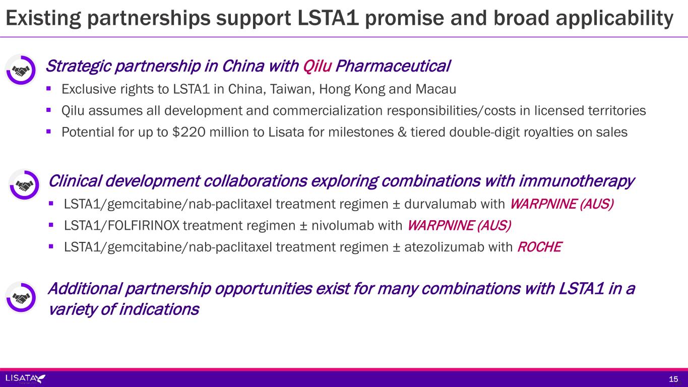 Development Partner(s) [Development Venue] Indication and Trial Product/Comparator Stage of Development Strategic Rationale Tartu University/Lisata [Estonia] First-line Glioblastoma Multiforme; Temozolomide ± LSTA1 Phase 2a Assess LSTA1 safety and effectiveness in additional tumor type (GBM) a in placebo- controlled trial UCSD/Columbia University/Lisata [United States] Peritoneal Carcinomatosis LSTA+HIPEC intraoperatively Phase 1b/2a Assess safety and intraoperative tumor penetration of HIPEC in combination with LSTA1 (open label) Qilu [China] First-line mPDAC; Gemcitabine/nab-paclitaxel + LSTA1 Phase 2b Continue development of LSTA1 in China (placebo controlled) Roche/Lisata [Multi-national] First-line mPDAC; Gemcitabine/nab-paclitaxel/LSTA1 ± atezolizumab Phase 1b/2 (MORPHEUS) Assess LSTA1 safety and effectiveness in combination with SoC chemotherapy & immunotherapy (controlled trial) LSTA1 capital efficient development plan; shared costs & selective geography 4040