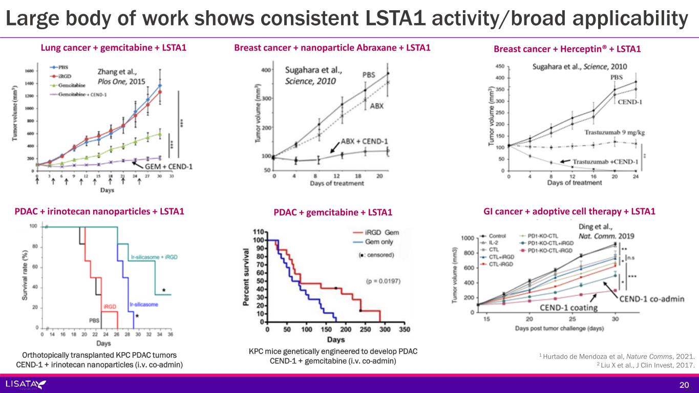 LSTA1 selectively and efficiently facilitates intratumoral penetration Whole body imaging of mice with pancreatic ductal adenocarcinoma (arrow) dosed with Fluorescent Quantum Dots (FQDs) with and without LSTA1 1 Braun et al., Nature Mater. 2014. 2 Liu, Braun et al., Nature Comm. 2017. 19  Etching solution quenches fluorescence in circulation  LSTA1 provides selective tumor penetration 19 LSTA1 + FQD + Etching solutionFQD + Etching solution