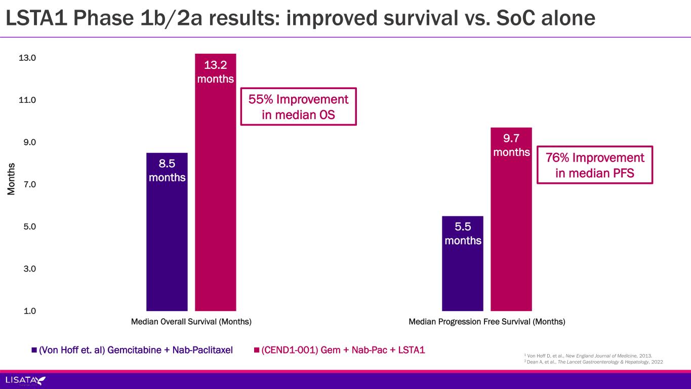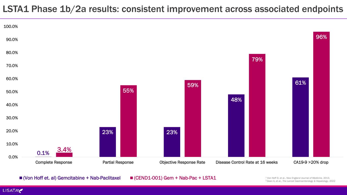 0.0% 10.0% 20.0% 30.0% 40.0% 50.0% 60.0% 70.0% 80.0% 90.0% 100.0% Complete Response Partial Response Objective Response Rate Disease Control Rate at 16 weeks CA19-9 >20% drop (Von Hoff et. al) Gemcitabine + Nab-Paclitaxel (CEND1-001) Gem + Nab-Pac + LSTA1 LSTA1 Phase 1b/2a results: consistent improvement across associated endpoints 1 Von Hoff D, et al., New England Journal of Medicine, 2013. 2 Dean A, et al., The Lancet Gastroenterology & Hepatology, 2022 59% 23% 3.4%0.1% 55% 23% 48% 79% 61% 96%