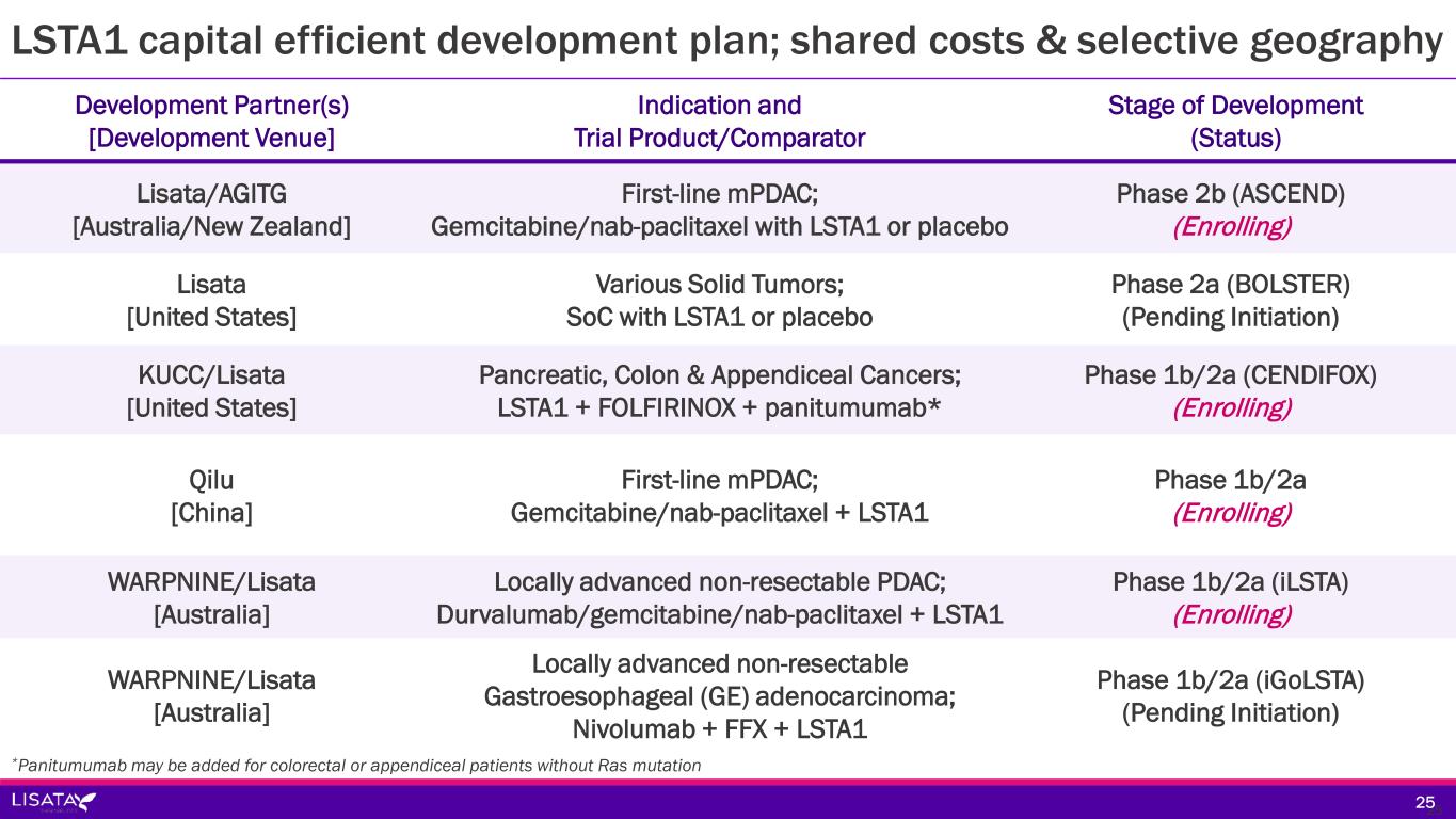 Development Partner(s) [Development Venue] Indication and Trial Product/Comparator Stage of Development (Status) Lisata/AGITG [Australia/New Zealand] First-line mPDAC; Gemcitabine/nab-paclitaxel with LSTA1 or placebo Phase 2b (ASCEND) (Enrolling) Lisata [United States] Various Solid Tumors; SoC with LSTA1 or placebo Phase 2a (BOLSTER) (Pending Initiation) KUCC/Lisata [United States] Pancreatic, Colon & Appendiceal Cancers; LSTA1 + FOLFIRINOX + panitumumab* Phase 1b/2a (CENDIFOX) (Enrolling) Qilu [China] First-line mPDAC; Gemcitabine/nab-paclitaxel + LSTA1 Phase 1b/2a (Enrolling) WARPNINE/Lisata [Australia] Locally advanced non-resectable PDAC; Durvalumab/gemcitabine/nab-paclitaxel + LSTA1 Phase 1b/2a (iLSTA) (Enrolling) WARPNINE/Lisata [Australia] Locally advanced non-resectable Gastroesophageal (GE) adenocarcinoma; Nivolumab + FFX + LSTA1 Phase 1b/2a (iGoLSTA) (Pending Initiation) LSTA1 capital efficient development plan; shared costs & selective geography 2525 *Panitumumab may be added for colorectal or appendiceal patients without Ras mutation