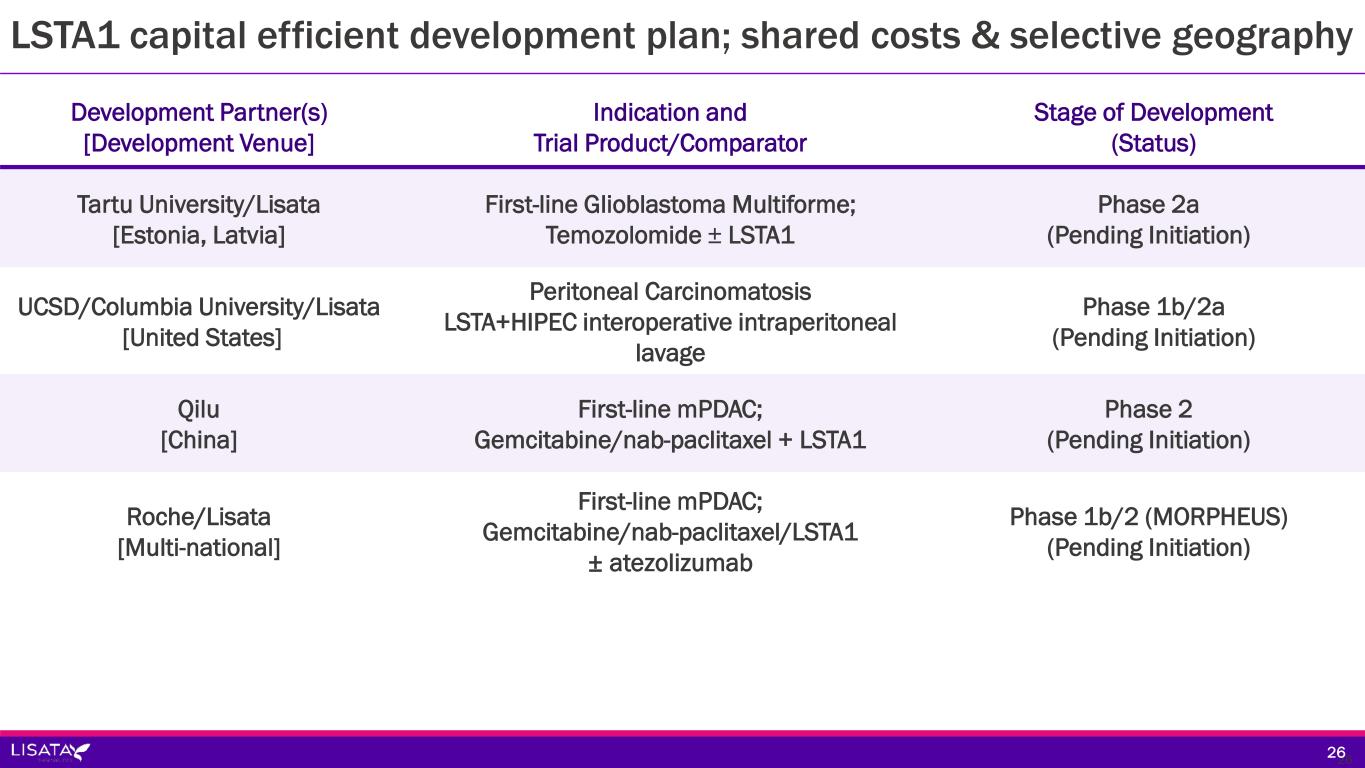 Development Partner(s) [Development Venue] Indication and Trial Product/Comparator Stage of Development (Status) Tartu University/Lisata [Estonia, Latvia] First-line Glioblastoma Multiforme; Temozolomide ± LSTA1 Phase 2a (Pending Initiation) UCSD/Columbia University/Lisata [United States] Peritoneal Carcinomatosis LSTA+HIPEC interoperative intraperitoneal lavage Phase 1b/2a (Pending Initiation) Qilu [China] First-line mPDAC; Gemcitabine/nab-paclitaxel + LSTA1 Phase 2 (Pending Initiation) Roche/Lisata [Multi-national] First-line mPDAC; Gemcitabine/nab-paclitaxel/LSTA1 ± atezolizumab Phase 1b/2 (MORPHEUS) (Pending Initiation) LSTA1 capital efficient development plan; shared costs & selective geography 2626