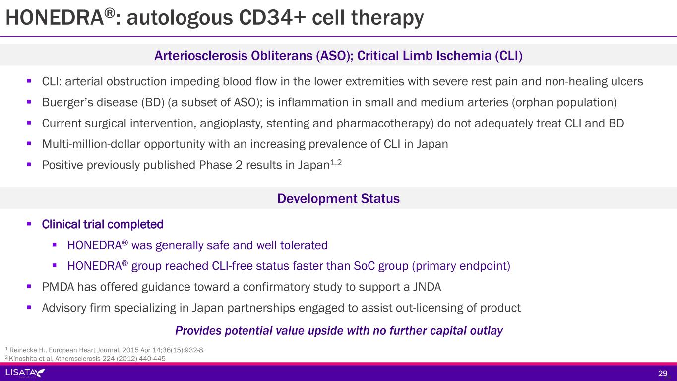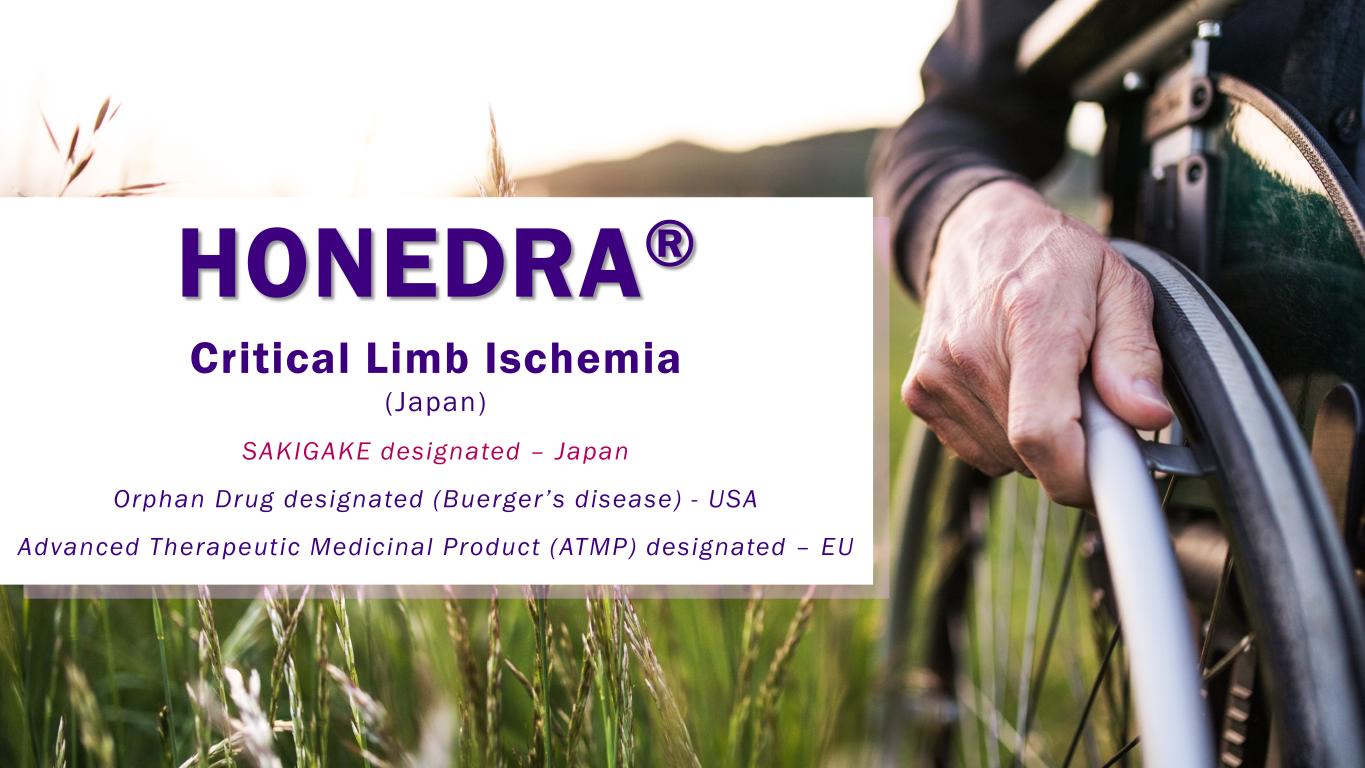 HONEDRA® Critical Limb Ischemia (Japan) SAKIGAKE designated – Japan Orphan Drug designated (Buerger’s disease) - USA Advanced Therapeutic Medicinal Product (ATMP) designated – EU