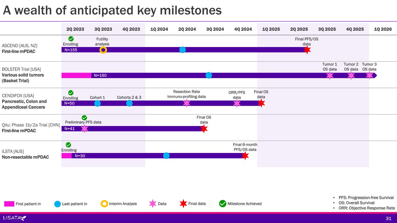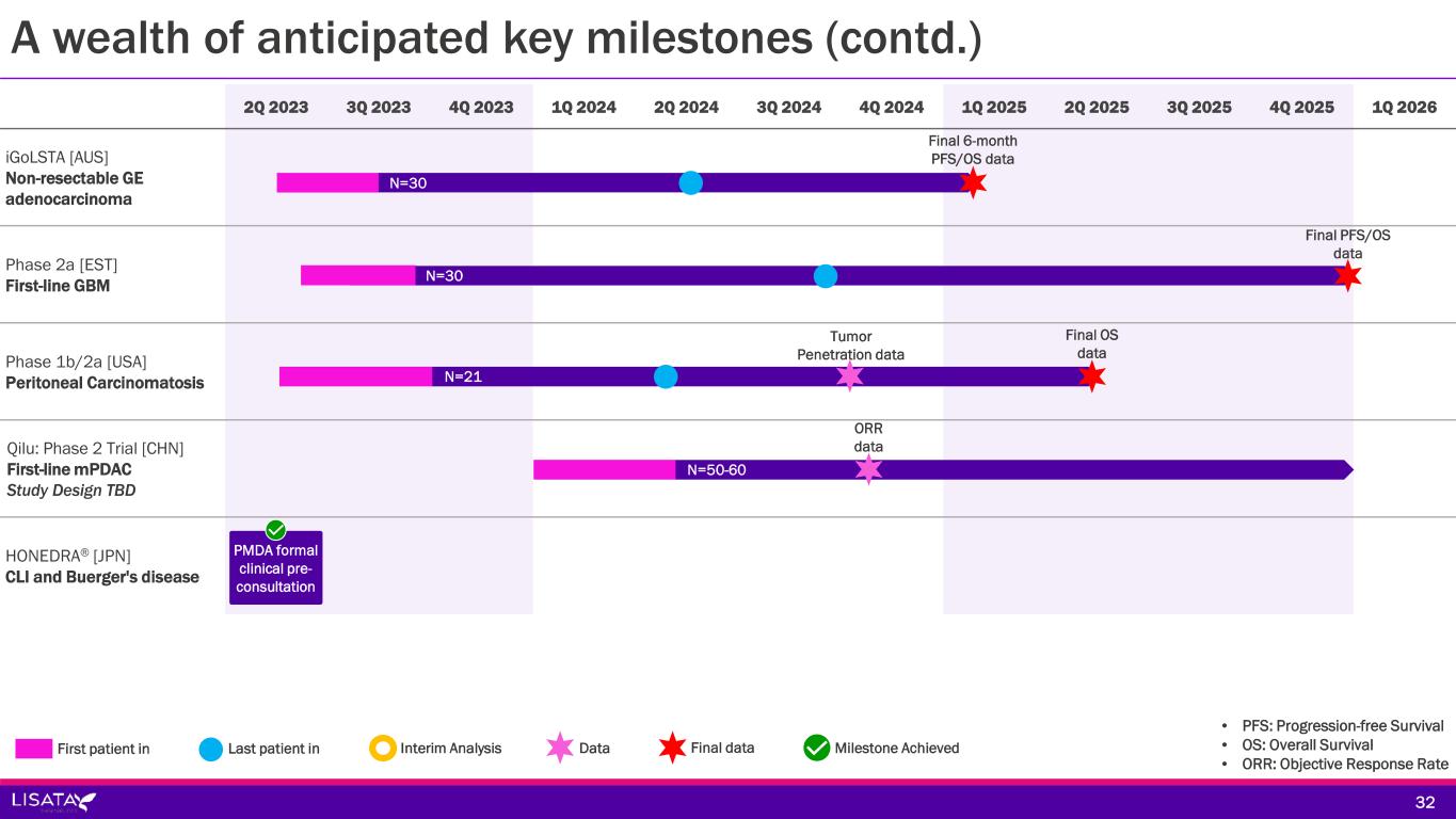 A wealth of anticipated key milestones 2Q 2023 3Q 2023 4Q 2023 1Q 2024 2Q 2024 3Q 2024 4Q 2024 1Q 2025 2Q 2025 3Q 2025 4Q 2025 1Q 2026 ASCEND [AUS, NZ] First-line mPDAC BOLSTER Trial [USA] Various solid tumors (Basket Trial) CENDIFOX [USA] Pancreatic, Colon and Appendiceal Cancers Qilu: Phase 1b/2a Trial [CHN] First-line mPDAC iLSTA [AUS] Non-resectable mPDAC N=155 Futility analysis N=160 Tumor 1 OS data Tumor 2 OS data Tumor 3 OS data N=50 Cohort 1 Cohorts 2 & 3 N=41 N=30 Resection Rate Immuno-profiling data ORR/PFS data Preliminary PFS data Final PFS/OS data Final OS data Final OS data Final 6-month PFS/OS data • PFS: Progression-free Survival • OS: Overall Survival • ORR: Objective Response Rate 31 Enrolling First patient in Last patient in Interim Analysis Data Final data Milestone Achieved Enrolling Enrolling