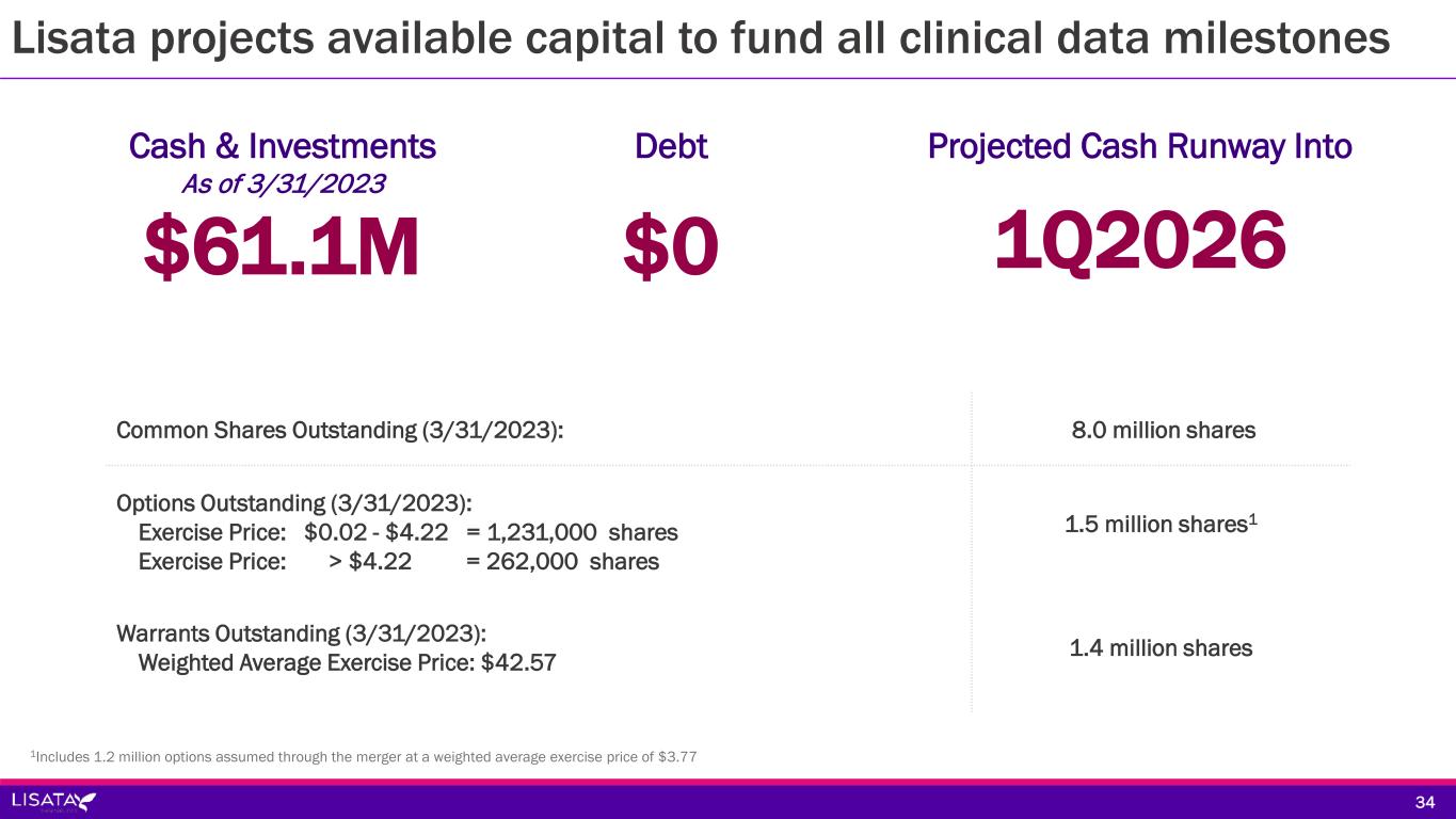$61.1M Cash & Investments As of 3/31/2023 $0 Debt 1Q2026 Projected Cash Runway Into Common Shares Outstanding (3/31/2023): 8.0 million shares Options Outstanding (3/31/2023): Exercise Price: $0.02 - $4.22 = 1,231,000 shares Exercise Price: > $4.22 = 262,000 shares 1.5 million shares1 Warrants Outstanding (3/31/2023): Weighted Average Exercise Price: $42.57 1.4 million shares 1Includes 1.2 million options assumed through the merger at a weighted average exercise price of $3.77 34 Lisata projects available capital to fund all clinical data milestones