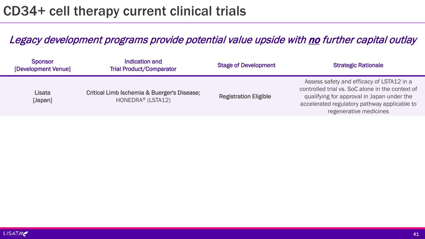 4141 Sponsor [Development Venue] Indication and Trial Product/Comparator Stage of Development Strategic Rationale Lisata [Japan] Critical Limb Ischemia & Buerger's Disease; HONEDRA® (LSTA12) Registration Eligible Assess safety and efficacy of LSTA12 in a controlled trial vs. SoC alone in the context of qualifying for approval in Japan under the accelerated regulatory pathway applicable to regenerative medicines CD34+ cell therapy current clinical trials Legacy development programs provide potential value upside with no further capital outlay