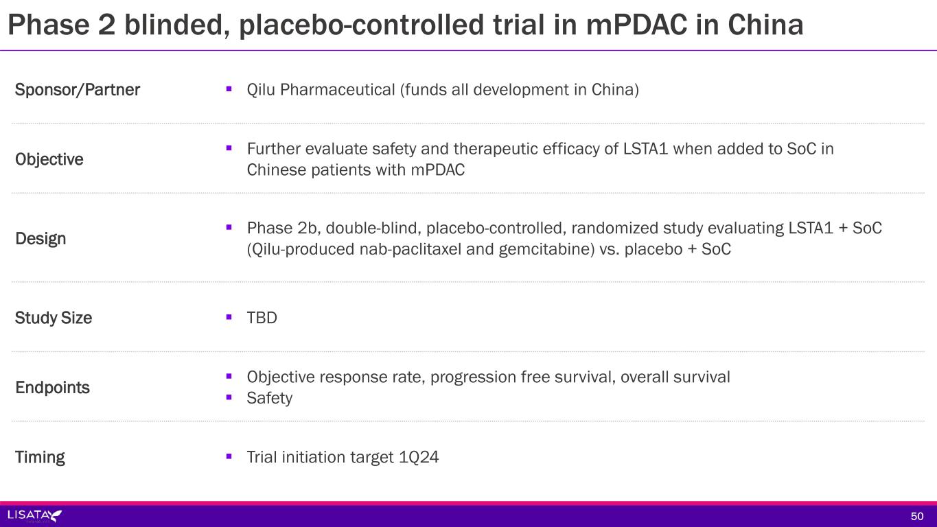 Sponsor/Partner  Qilu Pharmaceutical (funds all development in China) Objective  Further evaluate safety and therapeutic efficacy of LSTA1 when added to SoC in Chinese patients with mPDAC Design  Phase 2b, double-blind, placebo-controlled, randomized study evaluating LSTA1 + SoC (Qilu-produced nab-paclitaxel and gemcitabine) vs. placebo + SoC Study Size  TBD Endpoints  Objective response rate, progression free survival, overall survival  Safety Timing  Trial initiation target 1Q24 50 Phase 2 blinded, placebo-controlled trial in mPDAC in China