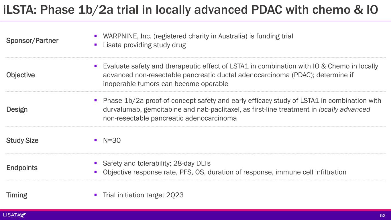 Days 1, 8, 15 and every 28 days Disease Progression Response rates PFS Safety Gemcitabine + Qilu produced nab-paclitaxel + LSTA1 3.2 mg/kg Confirm Eligibility Informed Consent 1:1 Survival AnalysismPDAC R Gemcitabine + Qilu produced nab-paclitaxel + placebo N=TBD N=TBD Phase 2b, double-blind, placebo-controlled, randomized, study evaluating LSTA1 when added to standard of care (nab-paclitaxel and gemcitabine) vs. standard of care alone and placebo in Chinese subjects with mPDAC • Sponsor/Partner: Qilu Pharmaceutical (funds all development in China) • Timing: Trial initiation target 4Q23 51 Phase 2 blinded, placebo-controlled trial in mPDAC in China