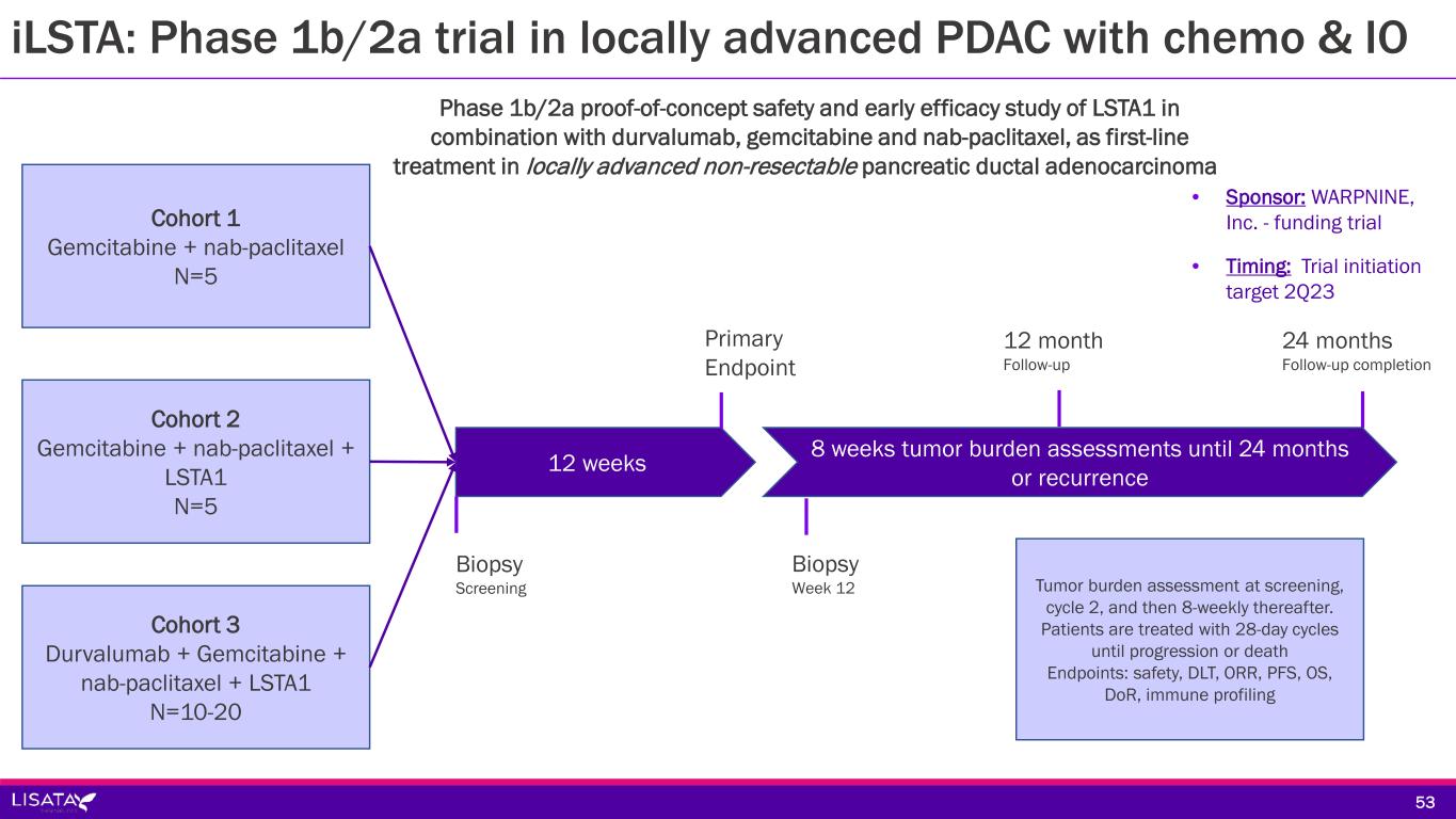 iLSTA: Phase 1b/2a trial in locally advanced PDAC with chemo & IO Sponsor/Partner  WARPNINE, Inc. (registered charity in Australia) is funding trial  Lisata providing study drug Objective  Evaluate safety and therapeutic effect of LSTA1 in combination with IO & Chemo in locally advanced non-resectable pancreatic ductal adenocarcinoma (PDAC); determine if inoperable tumors can become operable Design  Phase 1b/2a proof-of-concept safety and early efficacy study of LSTA1 in combination with durvalumab, gemcitabine and nab-paclitaxel, as first-line treatment in locally advanced non-resectable pancreatic adenocarcinoma Study Size  N=30 Endpoints  Safety and tolerability; 28-day DLTs  Objective response rate, PFS, OS, duration of response, immune cell infiltration Timing  Trial initiation target 2Q23 52
