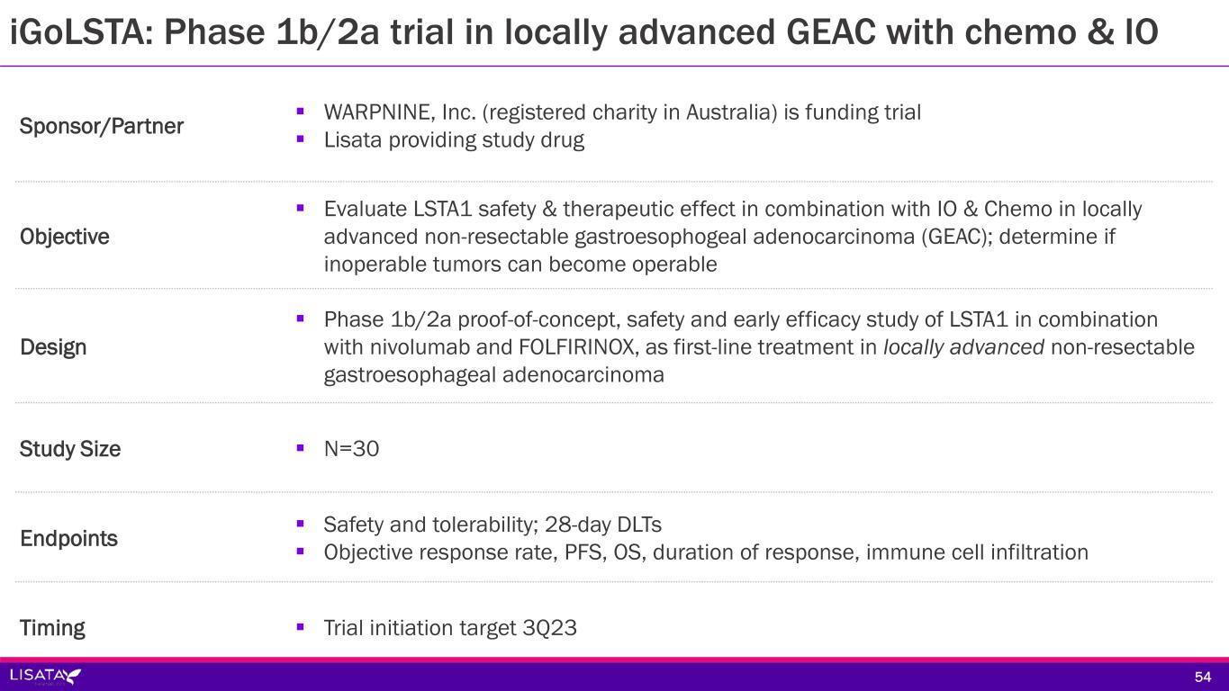 Sponsor/Partner  WARPNINE, Inc. (registered charity in Australia) is funding trial  Lisata providing study drug Objective  Evaluate LSTA1 safety & therapeutic effect in combination with IO & Chemo in locally advanced non-resectable gastroesophogeal adenocarcinoma (GEAC); determine if inoperable tumors can become operable Design  Phase 1b/2a proof-of-concept, safety and early efficacy study of LSTA1 in combination with nivolumab and FOLFIRINOX, as first-line treatment in locally advanced non-resectable gastroesophageal adenocarcinoma Study Size  N=30 Endpoints  Safety and tolerability; 28-day DLTs  Objective response rate, PFS, OS, duration of response, immune cell infiltration Timing  Trial initiation target 3Q23 54 iGoLSTA: Phase 1b/2a trial in locally advanced GEAC with chemo & IO