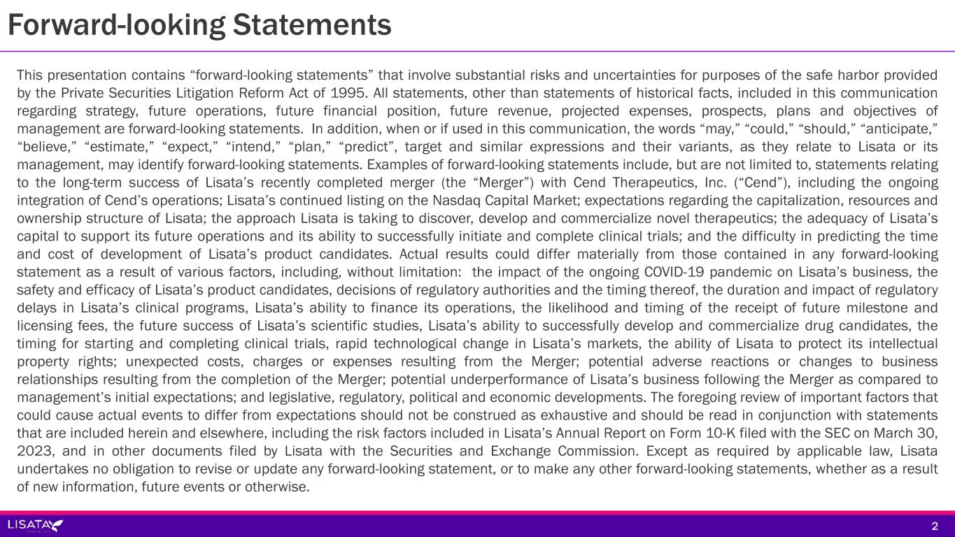 Forward-looking Statements This presentation contains “forward-looking statements” that involve substantial risks and uncertainties for purposes of the safe harbor provided by the Private Securities Litigation Reform Act of 1995. All statements, other than statements of historical facts, included in this communication regarding strategy, future operations, future financial position, future revenue, projected expenses, prospects, plans and objectives of management are forward-looking statements. In addition, when or if used in this communication, the words “may,” “could,” “should,” “anticipate,” “believe,” “estimate,” “expect,” “intend,” “plan,” “predict”, target and similar expressions and their variants, as they relate to Lisata or its management, may identify forward-looking statements. Examples of forward-looking statements include, but are not limited to, statements relating to the long-term success of Lisata’s recently completed merger (the “Merger”) with Cend Therapeutics, Inc. (“Cend”), including the ongoing integration of Cend’s operations; Lisata’s continued listing on the Nasdaq Capital Market; expectations regarding the capitalization, resources and ownership structure of Lisata; the approach Lisata is taking to discover, develop and commercialize novel therapeutics; the adequacy of Lisata’s capital to support its future operations and its ability to successfully initiate and complete clinical trials; and the difficulty in predicting the time and cost of development of Lisata’s product candidates. Actual results could differ materially from those contained in any forward-looking statement as a result of various factors, including, without limitation: the impact of the ongoing COVID-19 pandemic on Lisata’s business, the safety and efficacy of Lisata’s product candidates, decisions of regulatory authorities and the timing thereof, the duration and impact of regulatory delays in Lisata’s clinical programs, Lisata’s ability to finance its operations, the likelihood and timing of the receipt of future milestone and licensing fees, the future success of Lisata’s scientific studies, Lisata’s ability to successfully develop and commercialize drug candidates, the timing for starting and completing clinical trials, rapid technological change in Lisata’s markets, the ability of Lisata to protect its intellectual property rights; unexpected costs, charges or expenses resulting from the Merger; potential adverse reactions or changes to business relationships resulting from the completion of the Merger; potential underperformance of Lisata’s business following the Merger as compared to management’s initial expectations; and legislative, regulatory, political and economic developments. The foregoing review of important factors that could cause actual events to differ from expectations should not be construed as exhaustive and should be read in conjunction with statements that are included herein and elsewhere, including the risk factors included in Lisata’s Annual Report on Form 10-K filed with the SEC on March 30, 2023, and in other documents filed by Lisata with the Securities and Exchange Commission. Except as required by applicable law, Lisata undertakes no obligation to revise or update any forward-looking statement, or to make any other forward-looking statements, whether as a result of new information, future events or otherwise. 2
