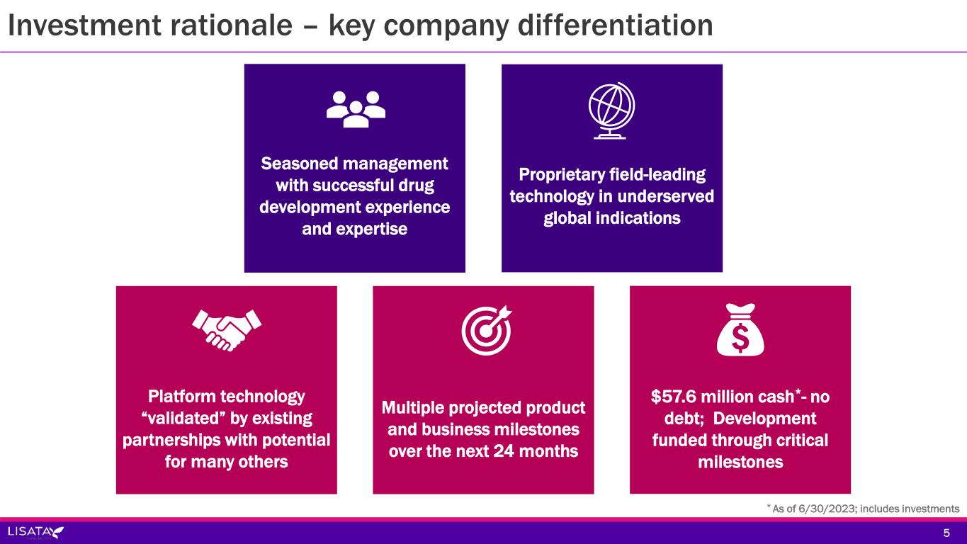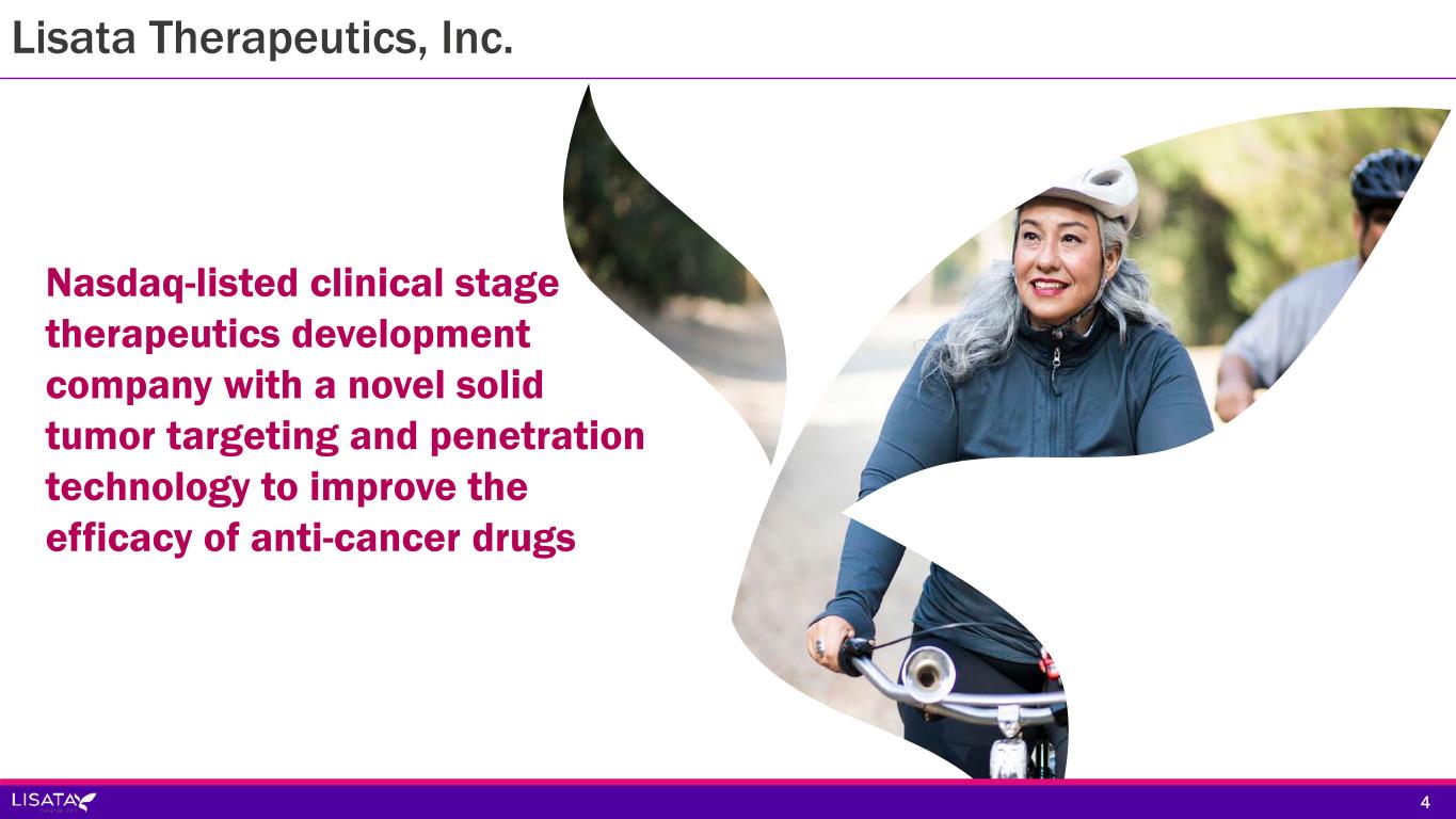 LISATA EUTICSTHERAP Nasdaq-listed clinical stage therapeutics development company with a novel solid tumor targeting and penetration technology to improve the efficacy of anti-cancer drugs 4 Lisata Therapeutics, Inc.
