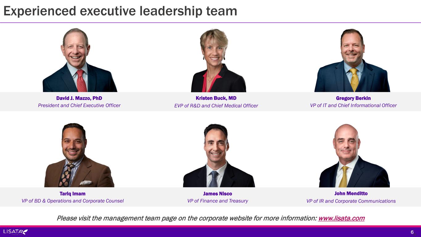 Investment rationale – key company differentiation 5 * As of 6/30/2023; includes investments $57.6 million cash*- no debt; Development funded through critical milestones Multiple projected product and business milestones over the next 24 months Seasoned management with successful drug development experience and expertise Proprietary field-leading technology in underserved global indications Platform technology “validated” by existing partnerships with potential for many others