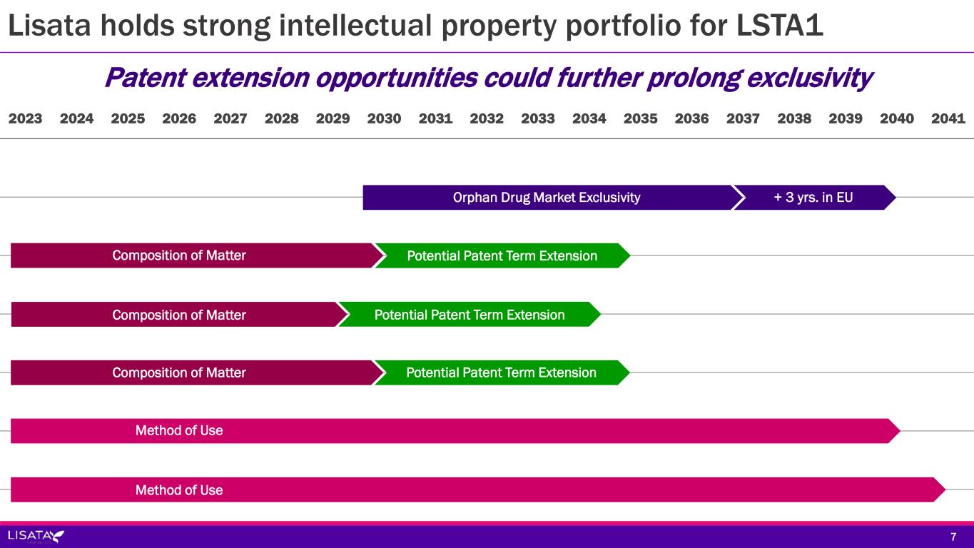 Lisata holds strong intellectual property portfolio for LSTA1 2023 2024 2025 2026 2027 2028 2029 2030 2031 2032 2033 2034 2035 2036 2037 2038 2039 2040 2041 7 Orphan Drug Market Exclusivity + 3 yrs. in EU Composition of Matter Potential Patent Term Extension Composition of Matter Potential Patent Term Extension Composition of Matter Potential Patent Term Extension Method of Use Method of Use Patent extension opportunities could further prolong exclusivity