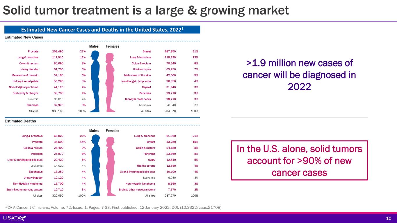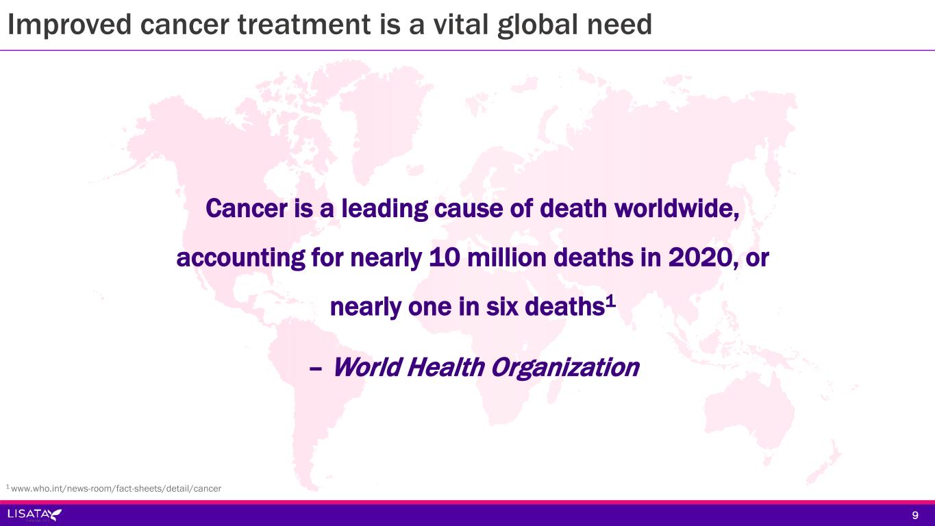 Improved cancer treatment is a vital global need 9 Cancer is a leading cause of death worldwide, accounting for nearly 10 million deaths in 2020, or nearly one in six deaths1 – World Health Organization 1 www.who.int/news-room/fact-sheets/detail/cancer