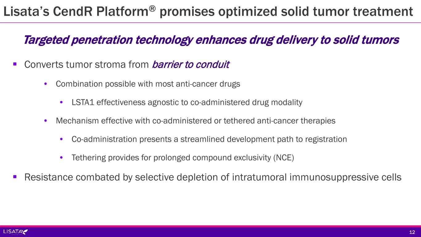 Lisata’s CendR Platform® promises optimized solid tumor treatment  Converts tumor stroma from barrier to conduit • Combination possible with most anti-cancer drugs • LSTA1 effectiveness agnostic to co-administered drug modality • Mechanism effective with co-administered or tethered anti-cancer therapies • Co-administration presents a streamlined development path to registration • Tethering provides for prolonged compound exclusivity (NCE)  Resistance combated by selective depletion of intratumoral immunosuppressive cells Targeted penetration technology enhances drug delivery to solid tumors 12