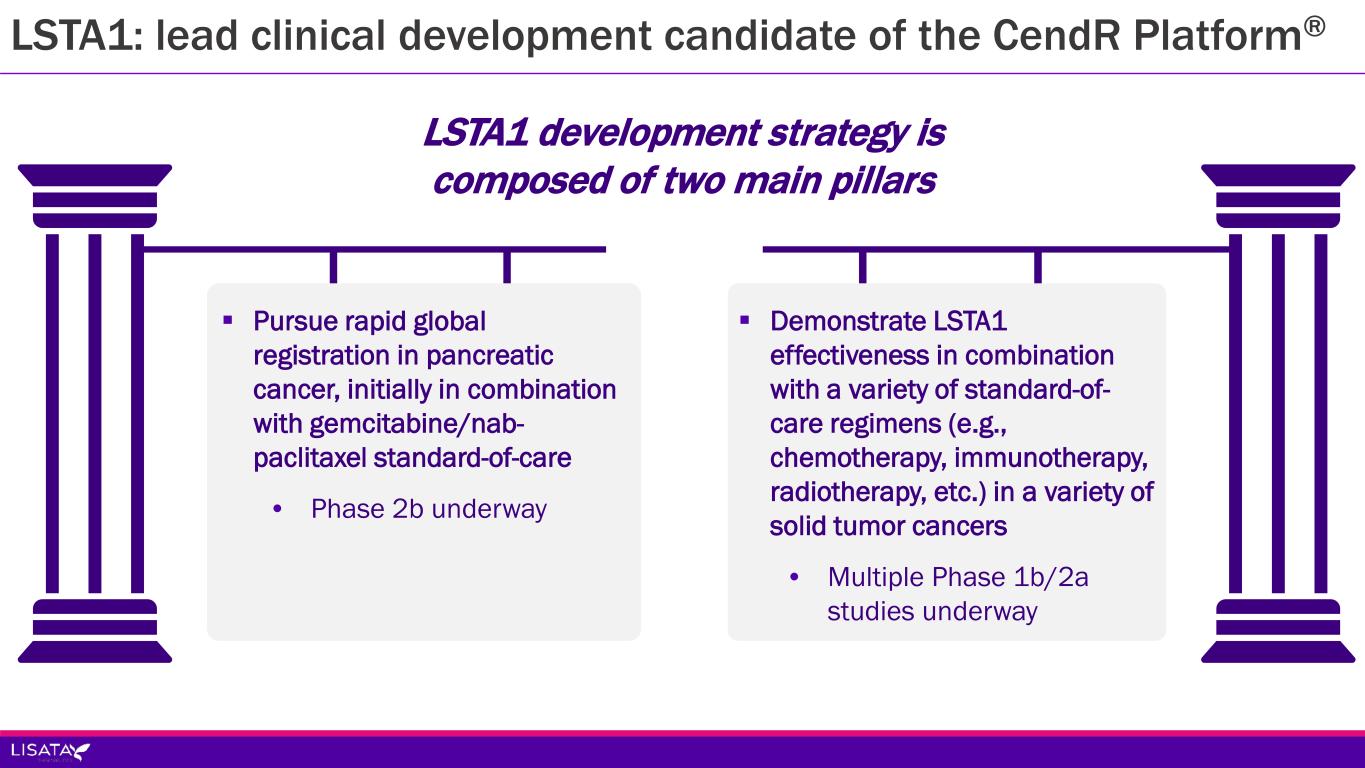 LSTA1: lead clinical development candidate of the CendR Platform®  Pursue rapid global registration in pancreatic cancer, initially in combination with gemcitabine/nab- paclitaxel standard-of-care • Phase 2b underway  Demonstrate LSTA1 effectiveness in combination with a variety of standard-of- care regimens (e.g., chemotherapy, immunotherapy, radiotherapy, etc.) in a variety of solid tumor cancers • Multiple Phase 1b/2a studies underway LSTA1 development strategy is composed of two main pillars
