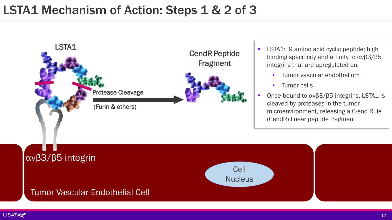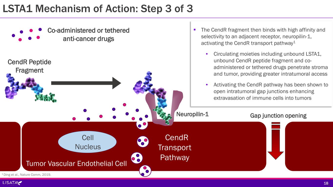 αvβ3/β5 integrin LSTA1 (Furin & others) Protease Cleavage CendR Peptide Fragment Tumor Vascular Endothelial Cell Cell Nucleus 17  LSTA1: 9 amino acid cyclic peptide; high binding specificity and affinity to αvβ3/β5 integrins that are upregulated on: • Tumor vascular endothelium • Tumor cells  Once bound to αvβ3/β5 integrins, LSTA1 is cleaved by proteases in the tumor microenvironment, releasing a C-end Rule (CendR) linear peptide fragment 17 LSTA1 Mechanism of Action: Steps 1 & 2 of 3