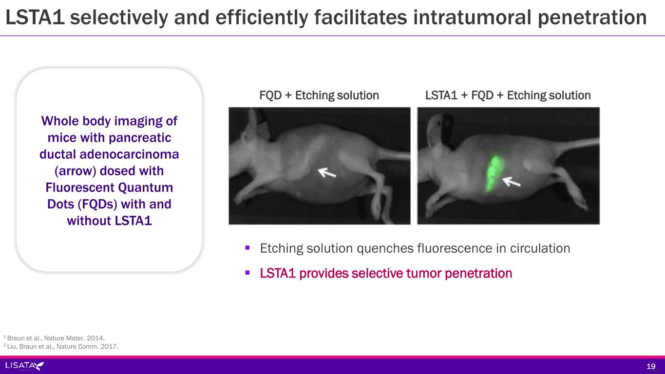 LSTA1 Mechanism of Action: Step 3 of 3 Neuropilin-1 CendR Peptide Fragment Co-administered or tethered anti-cancer drugs CendR Transport Pathway Tumor Vascular Endothelial Cell Cell Nucleus Gap junction opening 18  The CendR fragment then binds with high affinity and selectivity to an adjacent receptor, neuropilin-1, activating the CendR transport pathway1 • Circulating moieties including unbound LSTA1, unbound CendR peptide fragment and co- administered or tethered drugs penetrate stroma and tumor, providing greater intratumoral access • Activating the CendR pathway has been shown to open intratumoral gap junctions enhancing extravasation of immune cells into tumors 18 1 Ding et al., Nature Comm, 2019.