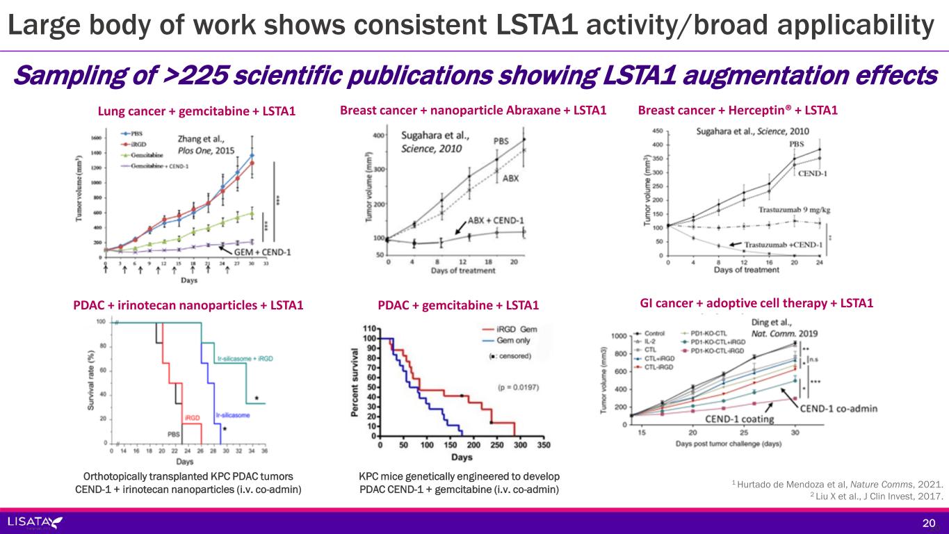 LSTA1 selectively and efficiently facilitates intratumoral penetration Whole body imaging of mice with pancreatic ductal adenocarcinoma (arrow) dosed with Fluorescent Quantum Dots (FQDs) with and without LSTA1 1 Braun et al., Nature Mater. 2014. 2 Liu, Braun et al., Nature Comm. 2017. 19  Etching solution quenches fluorescence in circulation  LSTA1 provides selective tumor penetration 19 LSTA1 + FQD + Etching solutionFQD + Etching solution