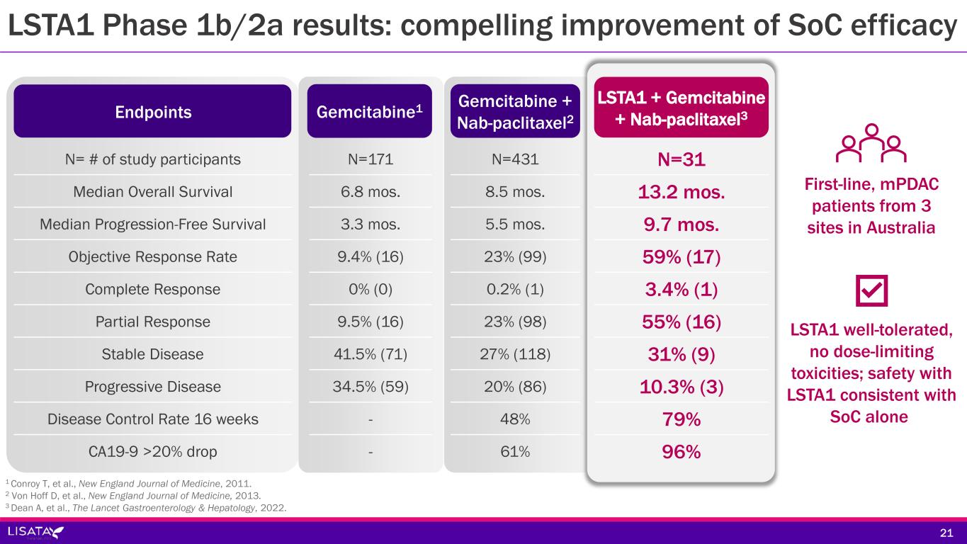 LSTA1 Phase 1b/2a results: compelling improvement of SoC efficacy N= # of study participants Median Overall Survival Median Progression-Free Survival Objective Response Rate Complete Response Partial Response Stable Disease Progressive Disease Disease Control Rate 16 weeks CA19-9 >20% drop N=171 6.8 mos. 3.3 mos. 9.4% (16) 0% (0) 9.5% (16) 41.5% (71) 34.5% (59) - - Gemcitabine + Nab-paclitaxel2 N=431 8.5 mos. 5.5 mos. 23% (99) 0.2% (1) 23% (98) 27% (118) 20% (86) 48% 61% Endpoints 1 Conroy T, et al., New England Journal of Medicine, 2011. 2 Von Hoff D, et al., New England Journal of Medicine, 2013. 3 Dean A, et al., The Lancet Gastroenterology & Hepatology, 2022. Gemcitabine1 LSTA1 well-tolerated, no dose-limiting toxicities; safety with LSTA1 consistent with SoC alone First-line, mPDAC patients from 3 sites in Australia N=31 13.2 mos. 9.7 mos. 59% (17) 3.4% (1) 55% (16) 31% (9) 10.3% (3) 79% 96% LSTA1 + Gemcitabine + Nab-paclitaxel3 21