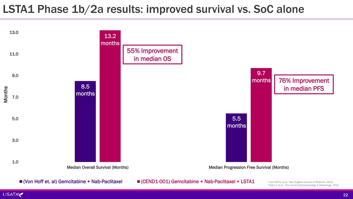 0.0% 10.0% 20.0% 30.0% 40.0% 50.0% 60.0% 70.0% 80.0% 90.0% 100.0% Complete Response Partial Response Objective Response Rate Disease Control Rate at 16 weeks CA19-9 >20% drop (Von Hoff et. al) Gemcitabine + Nab-Paclitaxel (CEND1-001) Gemcitabine + Nab-Paclitaxel + LSTA1 LSTA1 Phase 1b/2a results: consistent improvement across associated endpoints 1 Von Hoff D, et al., New England Journal of Medicine, 2013. 2 Dean A, et al., The Lancet Gastroenterology & Hepatology, 2022 59% 23% 3.4%0.1% 55% 23% 48% 79% 61% 96% 23