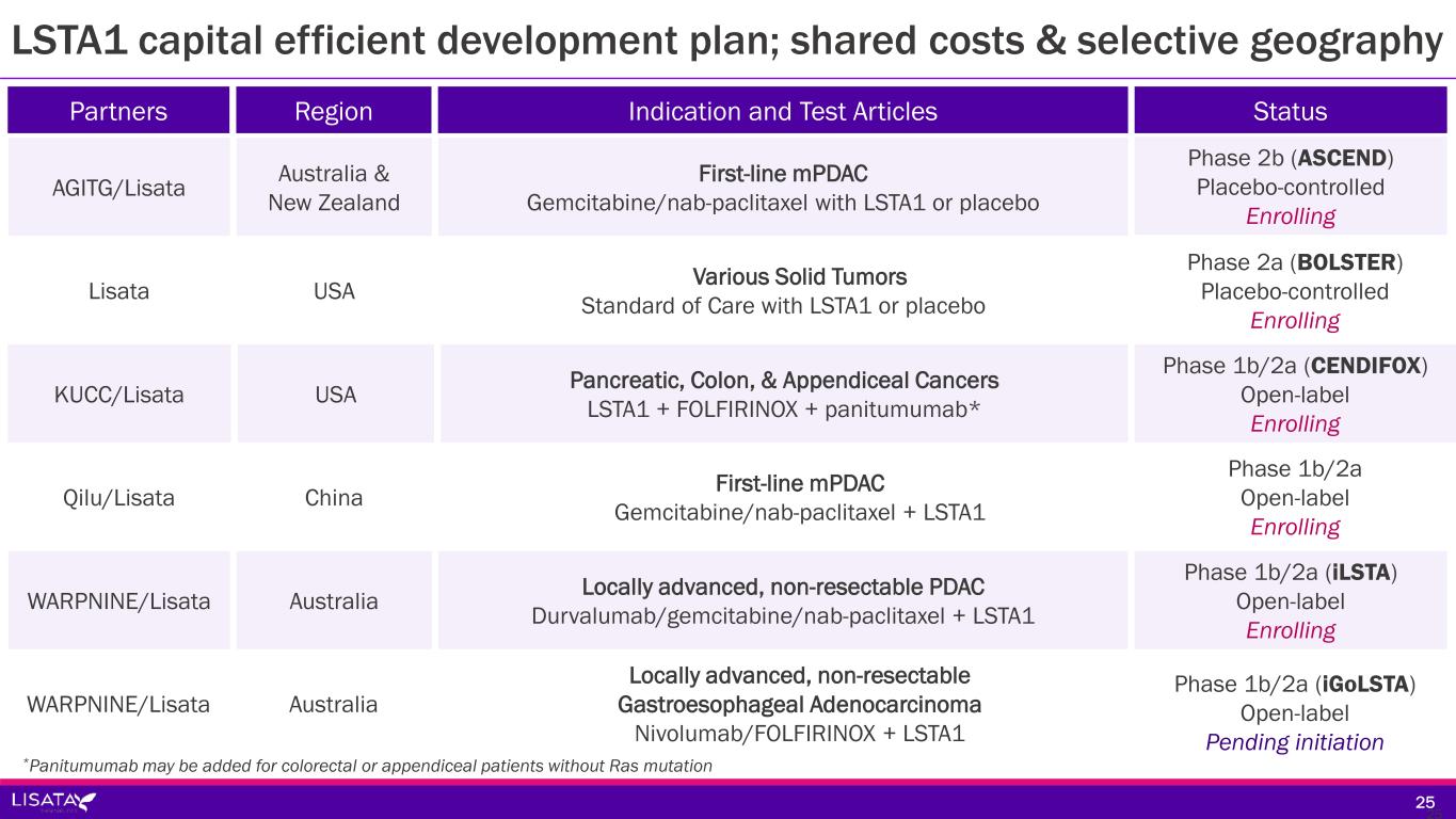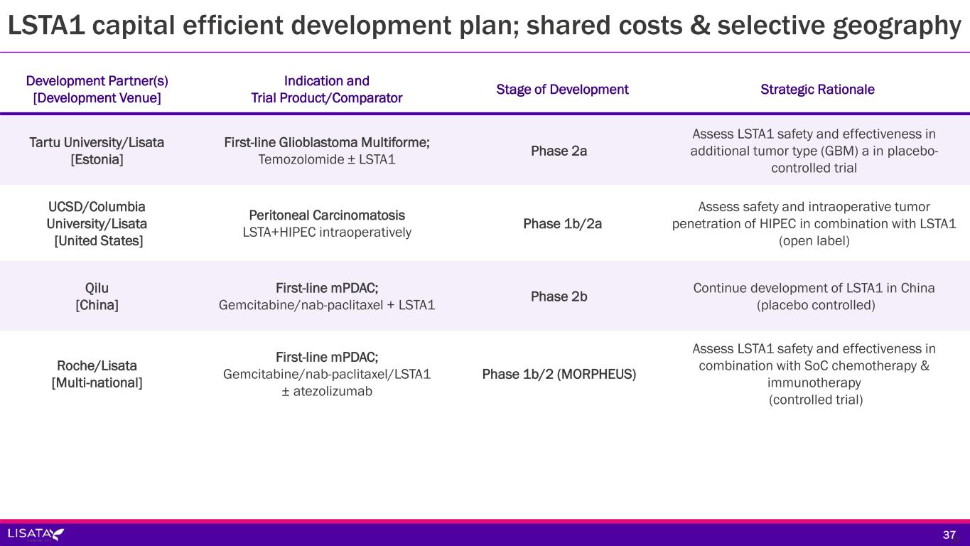 Development Partner(s) [Development Venue] Indication and Trial Product/Comparator Stage of Development Strategic Rationale Tartu University/Lisata [Estonia] First-line Glioblastoma Multiforme; Temozolomide ± LSTA1 Phase 2a Assess LSTA1 safety and effectiveness in additional tumor type (GBM) a in placebo- controlled trial UCSD/Columbia University/Lisata [United States] Peritoneal Carcinomatosis LSTA+HIPEC intraoperatively Phase 1b/2a Assess safety and intraoperative tumor penetration of HIPEC in combination with LSTA1 (open label) Qilu [China] First-line mPDAC; Gemcitabine/nab-paclitaxel + LSTA1 Phase 2b Continue development of LSTA1 in China (placebo controlled) Roche/Lisata [Multi-national] First-line mPDAC; Gemcitabine/nab-paclitaxel/LSTA1 ± atezolizumab Phase 1b/2 (MORPHEUS) Assess LSTA1 safety and effectiveness in combination with SoC chemotherapy & immunotherapy (controlled trial) LSTA1 capital efficient development plan; shared costs & selective geography 3737