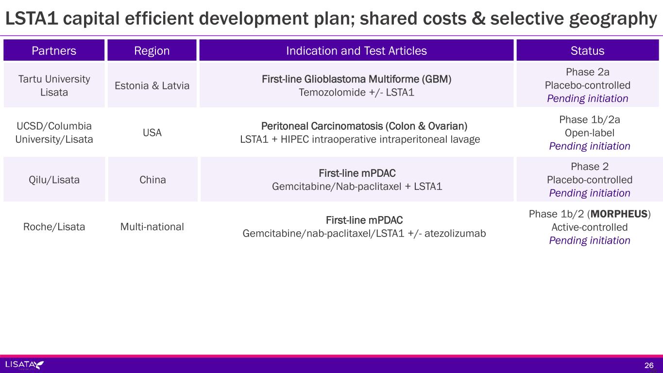 LSTA1 capital efficient development plan; shared costs & selective geography 25 *Panitumumab may be added for colorectal or appendiceal patients without Ras mutation First-line mPDAC Gemcitabine/nab-paclitaxel with LSTA1 or placeboAGITG/Lisata Phase 2b (ASCEND) Placebo-controlled Enrolling Australia & New Zealand Various Solid Tumors Standard of Care with LSTA1 or placebo Lisata Phase 2a (BOLSTER) Placebo-controlled Enrolling USA Pancreatic, Colon, & Appendiceal Cancers LSTA1 + FOLFIRINOX + panitumumab*KUCC/Lisata Phase 1b/2a (CENDIFOX) Open-label Enrolling USA First-line mPDAC Gemcitabine/nab-paclitaxel + LSTA1Qilu/Lisata Phase 1b/2a Open-label Enrolling China Locally advanced, non-resectable PDAC Durvalumab/gemcitabine/nab-paclitaxel + LSTA1WARPNINE/Lisata Phase 1b/2a (iLSTA) Open-label Enrolling Australia Locally advanced, non-resectable Gastroesophageal Adenocarcinoma Nivolumab/FOLFIRINOX + LSTA1 WARPNINE/Lisata Phase 1b/2a (iGoLSTA) Open-label Pending initiation Australia Partners Region Indication and Test Articles Status 25
