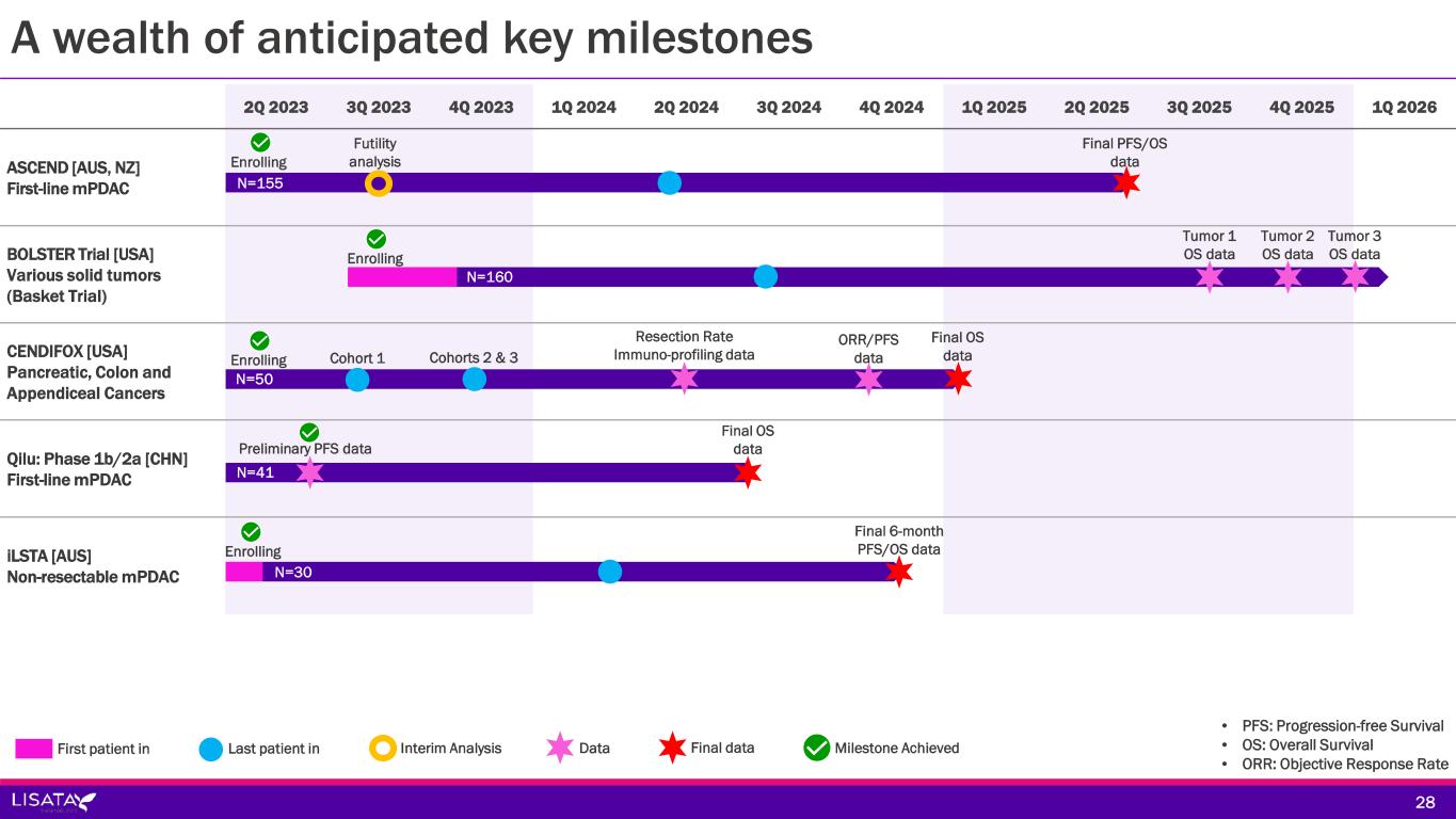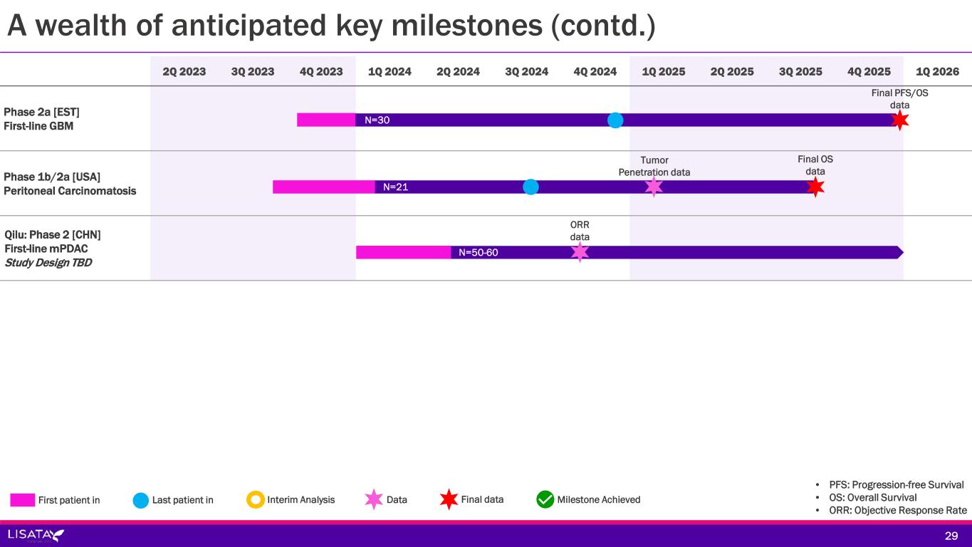 A wealth of anticipated key milestones 2Q 2023 3Q 2023 4Q 2023 1Q 2024 2Q 2024 3Q 2024 4Q 2024 1Q 2025 2Q 2025 3Q 2025 4Q 2025 1Q 2026 ASCEND [AUS, NZ] First-line mPDAC BOLSTER Trial [USA] Various solid tumors (Basket Trial) CENDIFOX [USA] Pancreatic, Colon and Appendiceal Cancers Qilu: Phase 1b/2a [CHN] First-line mPDAC iLSTA [AUS] Non-resectable mPDAC N=155 Futility analysis N=160 Tumor 1 OS data Tumor 2 OS data Tumor 3 OS data N=50 Cohort 1 Cohorts 2 & 3 N=41 N=30 Resection Rate Immuno-profiling data ORR/PFS data Preliminary PFS data Final PFS/OS data Final OS data Final OS data Final 6-month PFS/OS data • PFS: Progression-free Survival • OS: Overall Survival • ORR: Objective Response Rate 28 Enrolling First patient in Last patient in Interim Analysis Data Final data Milestone Achieved Enrolling Enrolling Enrolling