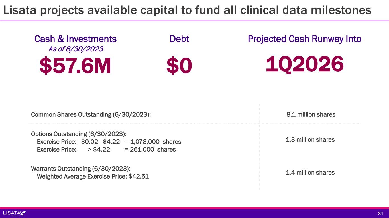 $57.6M Cash & Investments As of 6/30/2023 $0 Debt 1Q2026 Projected Cash Runway Into Common Shares Outstanding (6/30/2023): 8.1 million shares Options Outstanding (6/30/2023): Exercise Price: $0.02 - $4.22 = 1,078,000 shares Exercise Price: > $4.22 = 261,000 shares 1.3 million shares Warrants Outstanding (6/30/2023): Weighted Average Exercise Price: $42.51 1.4 million shares 31 Lisata projects available capital to fund all clinical data milestones