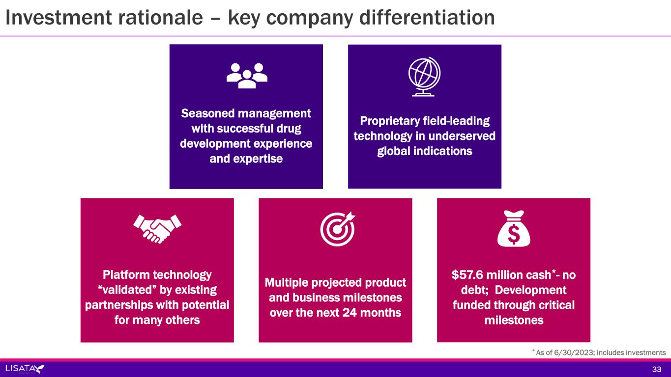Investment rationale – key company differentiation 33 * As of 6/30/2023; includes investments $57.6 million cash*- no debt; Development funded through critical milestones Multiple projected product and business milestones over the next 24 months Seasoned management with successful drug development experience and expertise Proprietary field-leading technology in underserved global indications Platform technology “validated” by existing partnerships with potential for many others