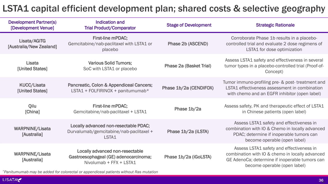 Development Partner(s) [Development Venue] Indication and Trial Product/Comparator Stage of Development Strategic Rationale Lisata/AGITG [Australia/New Zealand] First-line mPDAC; Gemcitabine/nab-paclitaxel with LSTA1 or placebo Phase 2b (ASCEND) Corroborate Phase 1b results in a placebo- controlled trial and evaluate 2 dose regimens of LSTA1 for dose optimization Lisata [United States] Various Solid Tumors; SoC with LSTA1 or placebo Phase 2a (Basket Trial) Assess LSTA1 safety and effectiveness in several tumor types in a placebo-controlled trial (Proof-of- Concept) KUCC/Lisata [United States] Pancreatic, Colon & Appendiceal Cancers; LSTA1 + FOLFIRINOX + panitumumab* Phase 1b/2a (CENDIFOX) Tumor immuno-profiling pre- & post- treatment and LSTA1 effectiveness assessment in combination with chemo and an EGFR inhibitor (open label) Qilu [China] First-line mPDAC; Gemcitabine/nab-paclitaxel + LSTA1 Phase 1b/2a Assess safety, PK and therapeutic effect of LSTA1 in Chinese patients (open label) WARPNINE/Lisata [Australia] Locally advanced non-resectable PDAC; Durvalumab/gemcitabine/nab-paclitaxel + LSTA1 Phase 1b/2a (iLSTA) Assess LSTA1 safety and effectiveness in combination with IO & Chemo in locally advanced PDAC; determine if inoperable tumors can become operable (open label) WARPNINE/Lisata [Australia] Locally advanced non-resectable Gastroesophageal (GE) adenocarcinoma; Nivolumab + FFX + LSTA1 Phase 1b/2a (iGoLSTA) Assess LSTA1 safety and effectiveness in combination with IO & chemo in locally advanced GE AdenoCa; determine if inoperable tumors can become operable (open label) LSTA1 capital efficient development plan; shared costs & selective geography 3636 *Panitumumab may be added for colorectal or appendiceal patients without Ras mutation