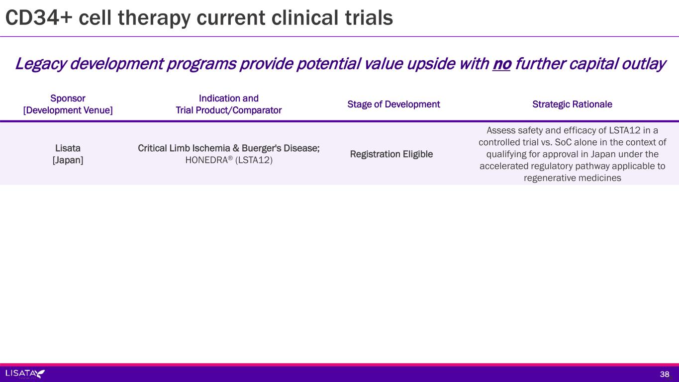 3838 Sponsor [Development Venue] Indication and Trial Product/Comparator Stage of Development Strategic Rationale Lisata [Japan] Critical Limb Ischemia & Buerger's Disease; HONEDRA® (LSTA12) Registration Eligible Assess safety and efficacy of LSTA12 in a controlled trial vs. SoC alone in the context of qualifying for approval in Japan under the accelerated regulatory pathway applicable to regenerative medicines CD34+ cell therapy current clinical trials Legacy development programs provide potential value upside with no further capital outlay