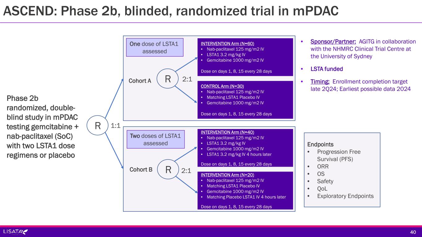 ASCEND: Phase 2b, blinded, randomized trial in mPDAC Sponsor/Partner  Australasian Gastro-Intestinal Trials Group (AGITG) in collaboration with the NHMRC Clinical Trials Centre at the University of Sydney  Lisata funded (LSTA eligible for ~43% rebate on all qualified R&D expenses in AUS) Objective  Corroborate Phase 1b results in a placebo-controlled study  Determine if a second dose of LSTA1 further improves patient outcomes Design  Phase 2b randomized, double-blind study in mPDAC testing gemcitabine + nab-paclitaxel SoC with one of two LSTA1 dose regimens or placebo Study Size  ~150 subjects (~40 sites planned in Australia and New Zealand) Endpoints  Primary: Progression Free Survival  Secondary: AEs, SAEs, Overall Survival, Objective Tumor Response Rate Timing  Enrollment completion target late 2Q24  Earliest possible data 2024 3939