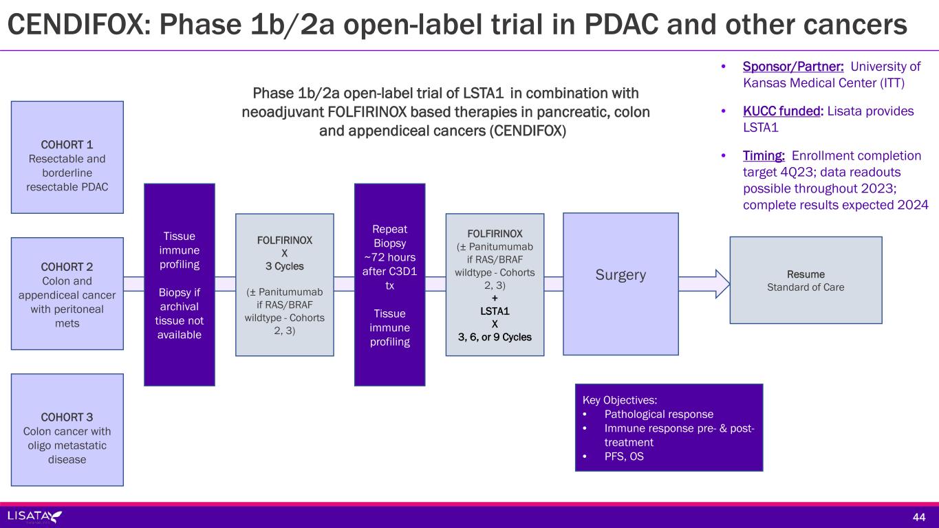 Sponsor/Partner  University of Kansas Medical Center (Investigator initiated trial in U.S.)  KUCC funded; Lisata provides LSTA1 Objective  Evaluate the safety and therapeutic effect of LSTA1 in combination with neoadjuvant FOLFIRINOX-based therapies and an EGFR inhibitor for the treatment of pancreatic, colon and appendiceal cancers and determine immuno-profiling in tumor pre- & post- treatment Design  Phase 1b/2a open-label study in resectable pancreatic, colon with oligo metastases and appendiceal with peritoneal metastases cancers testing SoC chemotherapy (neoadjuvant FOLFIRINOX-based therapies) with LSTA1 ± panitumumab Study Size  50 subjects (20 PDAC, 15 colon and 15 appendiceal) Endpoints  Primary: Drug Safety  Secondary: Overall Survival, Disease-free Survival, Overall Response Rate, RO Resection Rate, Pathological Response Rate Timing  Enrollment completion target 4Q23  Data readouts possible throughout 2023 with complete results expected 2024 4343 CENDIFOX: Phase 1b/2a open-label trial in PDAC and other cancers