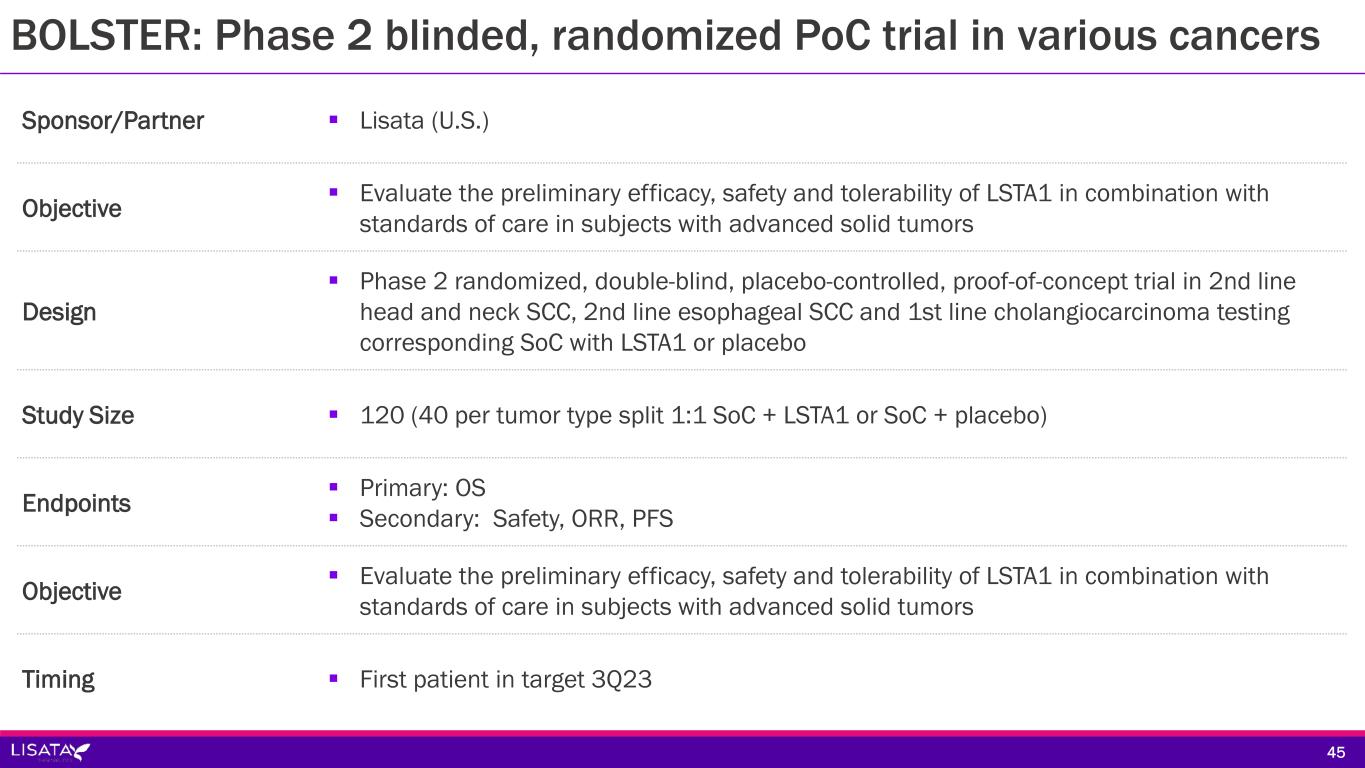 Surgery COHORT 1 Resectable and borderline resectable PDAC Key Objectives: • Pathological response • Immune response pre- & post- treatment • PFS, OS FOLFIRINOX X 3 Cycles (± Panitumumab if RAS/BRAF wildtype - Cohorts 2, 3) Tissue immune profiling Biopsy if archival tissue not available COHORT 2 Colon and appendiceal cancer with peritoneal mets COHORT 3 Colon cancer with oligo metastatic disease Repeat Biopsy ~72 hours after C3D1 tx Tissue immune profiling FOLFIRINOX (± Panitumumab if RAS/BRAF wildtype - Cohorts 2, 3) + LSTA1 X 3, 6, or 9 Cycles Resume Standard of Care Phase 1b/2a open-label trial of LSTA1 in combination with neoadjuvant FOLFIRINOX based therapies in pancreatic, colon and appendiceal cancers (CENDIFOX) • Sponsor/Partner: University of Kansas Medical Center (ITT) • KUCC funded: Lisata provides LSTA1 • Timing: Enrollment completion target 4Q23; data readouts possible throughout 2023; complete results expected 2024 44 CENDIFOX: Phase 1b/2a open-label trial in PDAC and other cancers
