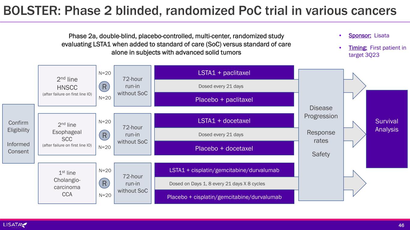 Sponsor/Partner  Lisata (U.S.) Objective  Evaluate the preliminary efficacy, safety and tolerability of LSTA1 in combination with standards of care in subjects with advanced solid tumors Design  Phase 2 randomized, double-blind, placebo-controlled, proof-of-concept trial in 2nd line head and neck SCC, 2nd line esophageal SCC and 1st line cholangiocarcinoma testing corresponding SoC with LSTA1 or placebo Study Size  120 (40 per tumor type split 1:1 SoC + LSTA1 or SoC + placebo) Endpoints  Primary: OS  Secondary: Safety, ORR, PFS Objective  Evaluate the preliminary efficacy, safety and tolerability of LSTA1 in combination with standards of care in subjects with advanced solid tumors Timing  First patient in target 3Q23 45 BOLSTER: Phase 2 blinded, randomized PoC trial in various cancers