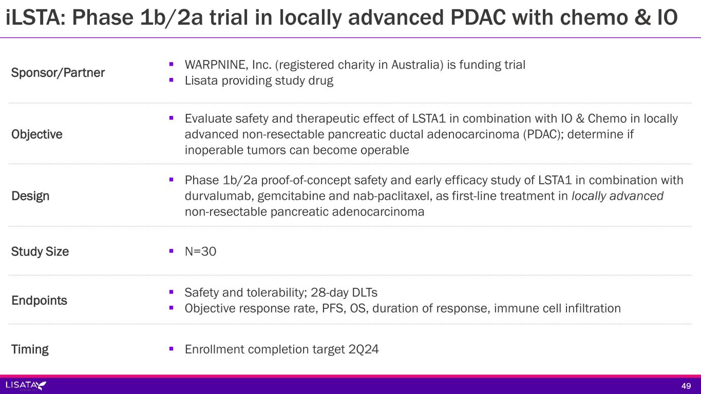 Days 1, 8, 15 and every 28 days Disease Progression Response rates PFS Safety Gemcitabine + Qilu produced nab-paclitaxel + LSTA1 3.2 mg/kg Confirm Eligibility Informed Consent 1:1 Survival AnalysismPDAC R Gemcitabine + Qilu produced nab-paclitaxel + placebo N=TBD N=TBD Phase 2b, double-blind, placebo-controlled, randomized, study evaluating LSTA1 when added to standard of care (nab-paclitaxel and gemcitabine) vs. standard of care alone and placebo in Chinese subjects with mPDAC • Sponsor/Partner: Qilu Pharmaceutical (funds all development in China) • Timing: Trial initiation target 4Q23 48 Phase 2 blinded, placebo-controlled trial in mPDAC in China