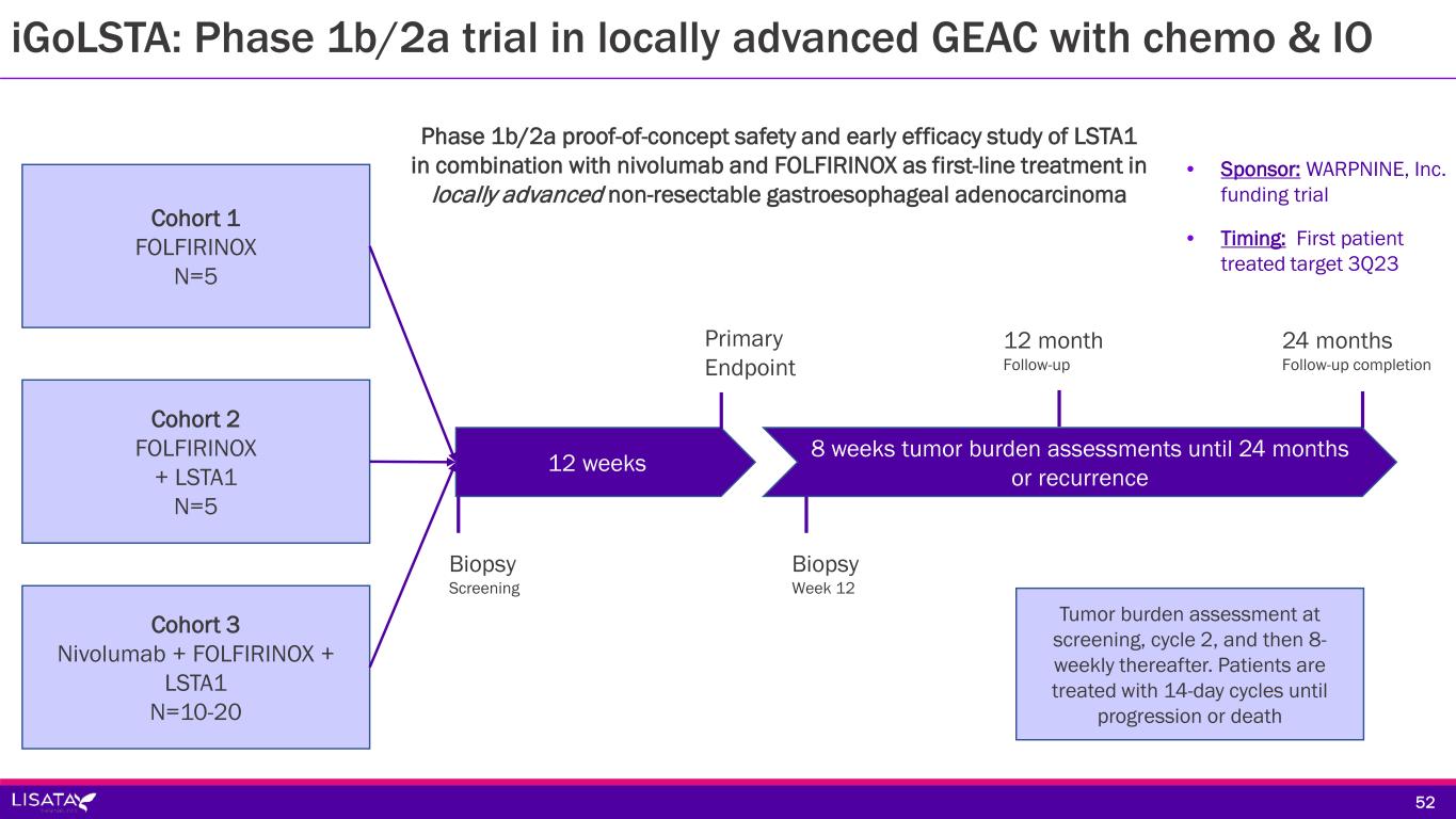 Sponsor/Partner  WARPNINE, Inc. (registered charity in Australia) is funding trial  Lisata providing study drug Objective  Evaluate LSTA1 safety & therapeutic effect in combination with IO & Chemo in locally advanced non-resectable gastroesophogeal adenocarcinoma (GEAC); determine if inoperable tumors can become operable Design  Phase 1b/2a proof-of-concept, safety and early efficacy study of LSTA1 in combination with nivolumab and FOLFIRINOX, as first-line treatment in locally advanced non-resectable gastroesophageal adenocarcinoma Study Size  N=30 Endpoints  Safety and tolerability; 28-day DLTs  Objective response rate, PFS, OS, duration of response, immune cell infiltration Timing  First patient treated target 3Q23 51 iGoLSTA: Phase 1b/2a trial in locally advanced GEAC with chemo & IO