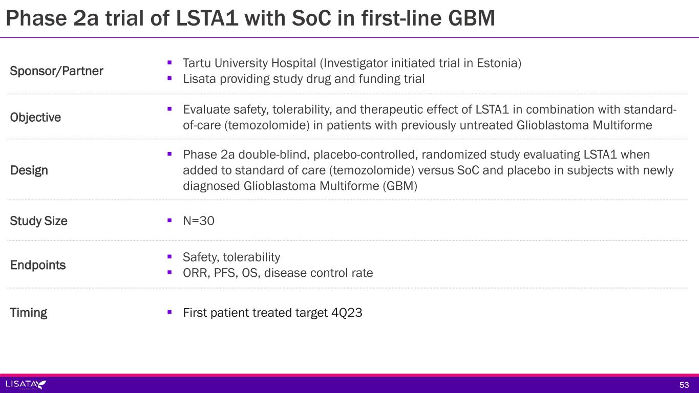 Sponsor/Partner  Tartu University Hospital (Investigator initiated trial in Estonia)  Lisata providing study drug and funding trial Objective  Evaluate safety, tolerability, and therapeutic effect of LSTA1 in combination with standard- of-care (temozolomide) in patients with previously untreated Glioblastoma Multiforme Design  Phase 2a double-blind, placebo-controlled, randomized study evaluating LSTA1 when added to standard of care (temozolomide) versus SoC and placebo in subjects with newly diagnosed Glioblastoma Multiforme (GBM) Study Size  N=30 Endpoints  Safety, tolerability  ORR, PFS, OS, disease control rate Timing  First patient treated target 4Q23 53 Phase 2a trial of LSTA1 with SoC in first-line GBM