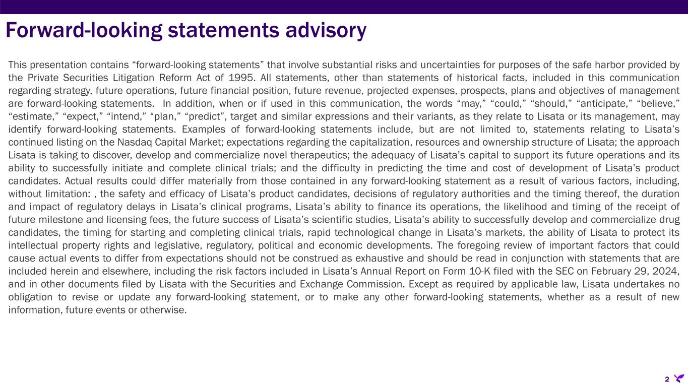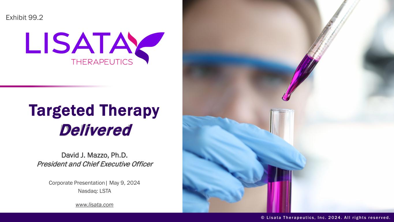© L i s a t a T h e r a p e u t i c s , I n c . 2 0 2 4 . A l l r i g h t s r e s e r v e d . Targeted Therapy Delivered David J. Mazzo, Ph.D. President and Chief Executive Officer www.lisata.com Corporate Presentation| May 9, 2024 Nasdaq: LSTA Exhibit 99.2