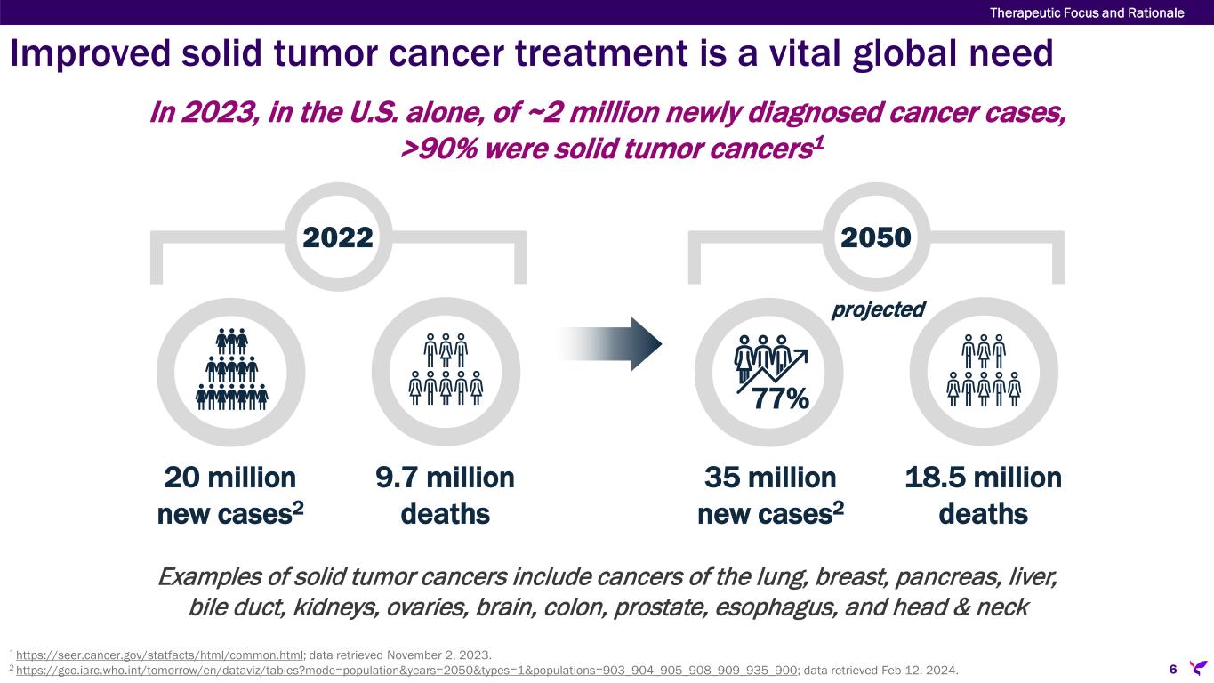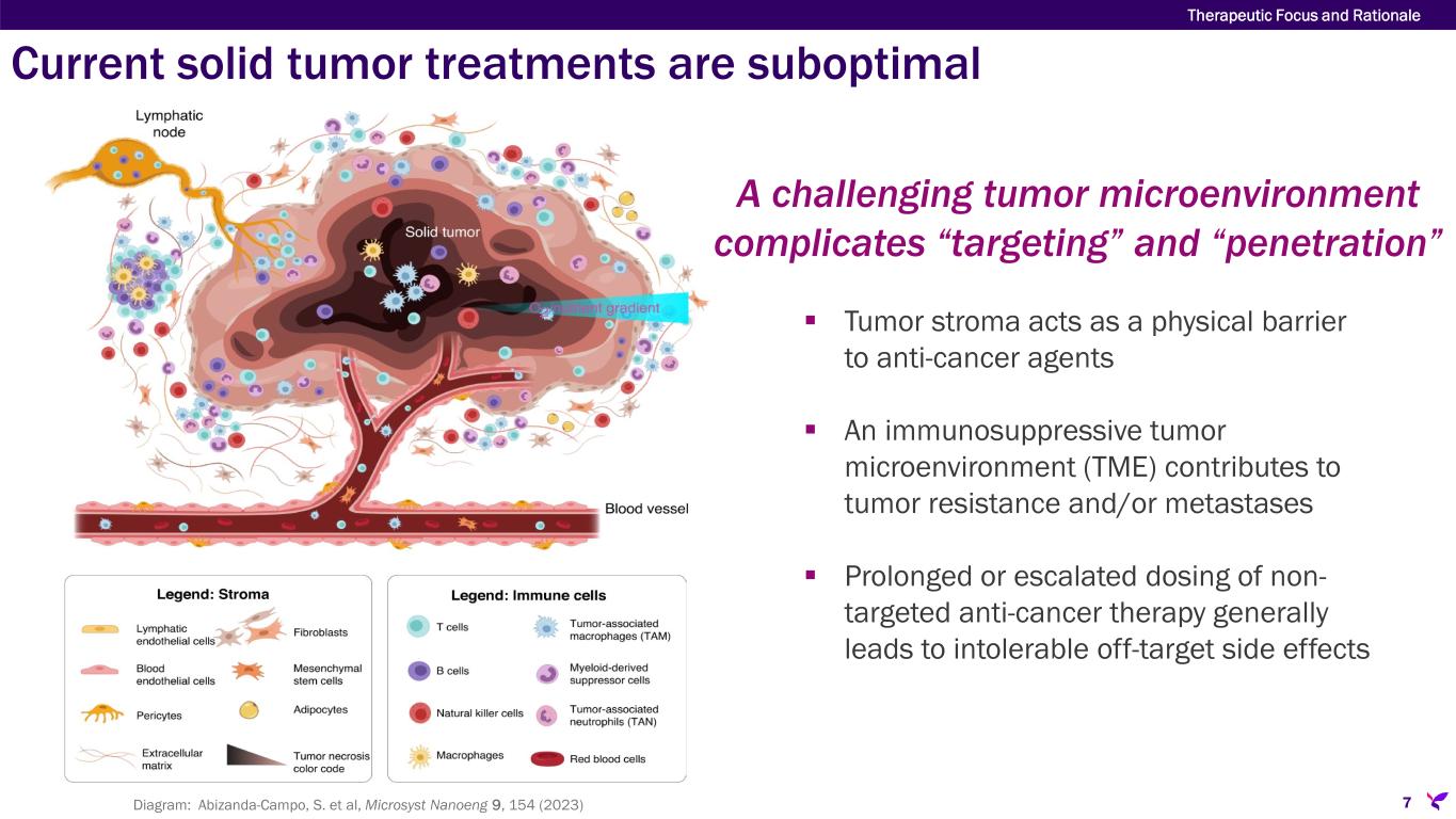 Improved solid tumor cancer treatment is a vital global need Therapeutic Focus and Rationale 6 2022 20 million new cases2 9.7 million deaths 2050 35 million new cases2 18.5 million deaths 77% In 2023, in the U.S. alone, of ~2 million newly diagnosed cancer cases, >90% were solid tumor cancers1 1 https://seer.cancer.gov/statfacts/html/common.html; data retrieved November 2, 2023. 2 https://gco.iarc.who.int/tomorrow/en/dataviz/tables?mode=population&years=2050&types=1&populations=903_904_905_908_909_935_900; data retrieved Feb 12, 2024. Examples of solid tumor cancers include cancers of the lung, breast, pancreas, liver, bile duct, kidneys, ovaries, brain, colon, prostate, esophagus, and head & neck projected