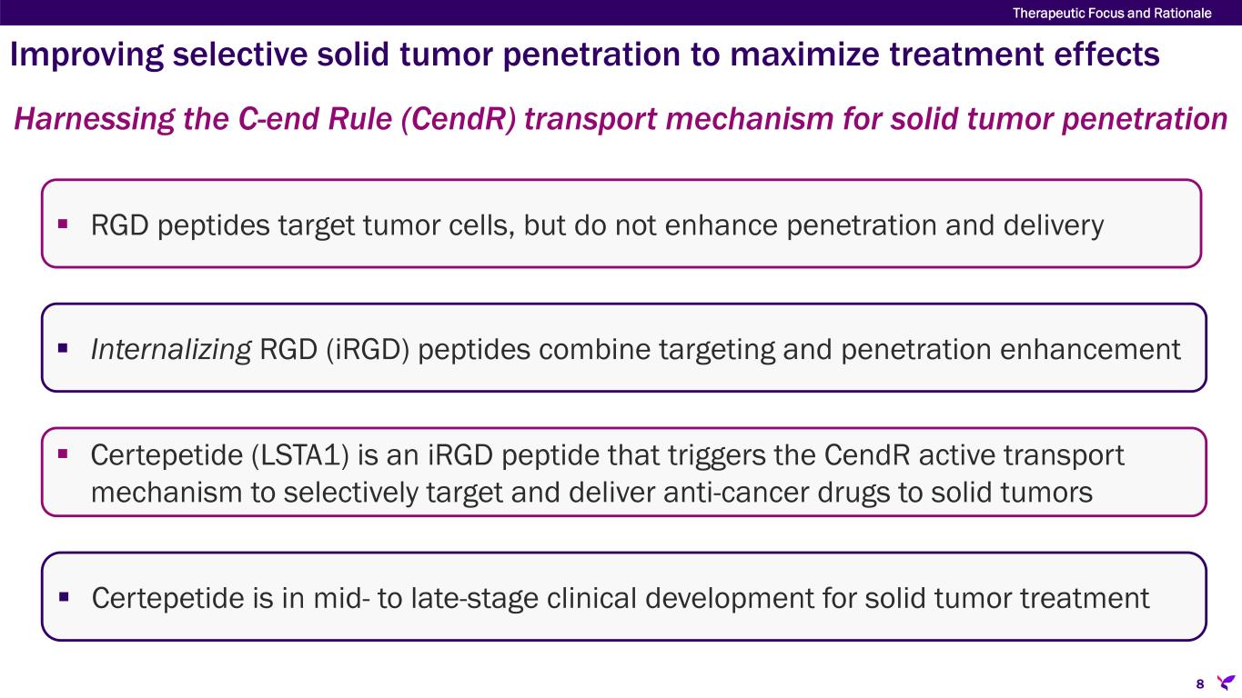 7 Therapeutic Focus and Rationale Current solid tumor treatments are suboptimal  Tumor stroma acts as a physical barrier to anti-cancer agents  An immunosuppressive tumor microenvironment (TME) contributes to tumor resistance and/or metastases  Prolonged or escalated dosing of non- targeted anti-cancer therapy generally leads to intolerable off-target side effects Diagram: Abizanda-Campo, S. et al, Microsyst Nanoeng 9, 154 (2023) A challenging tumor microenvironment complicates “targeting” and “penetration”