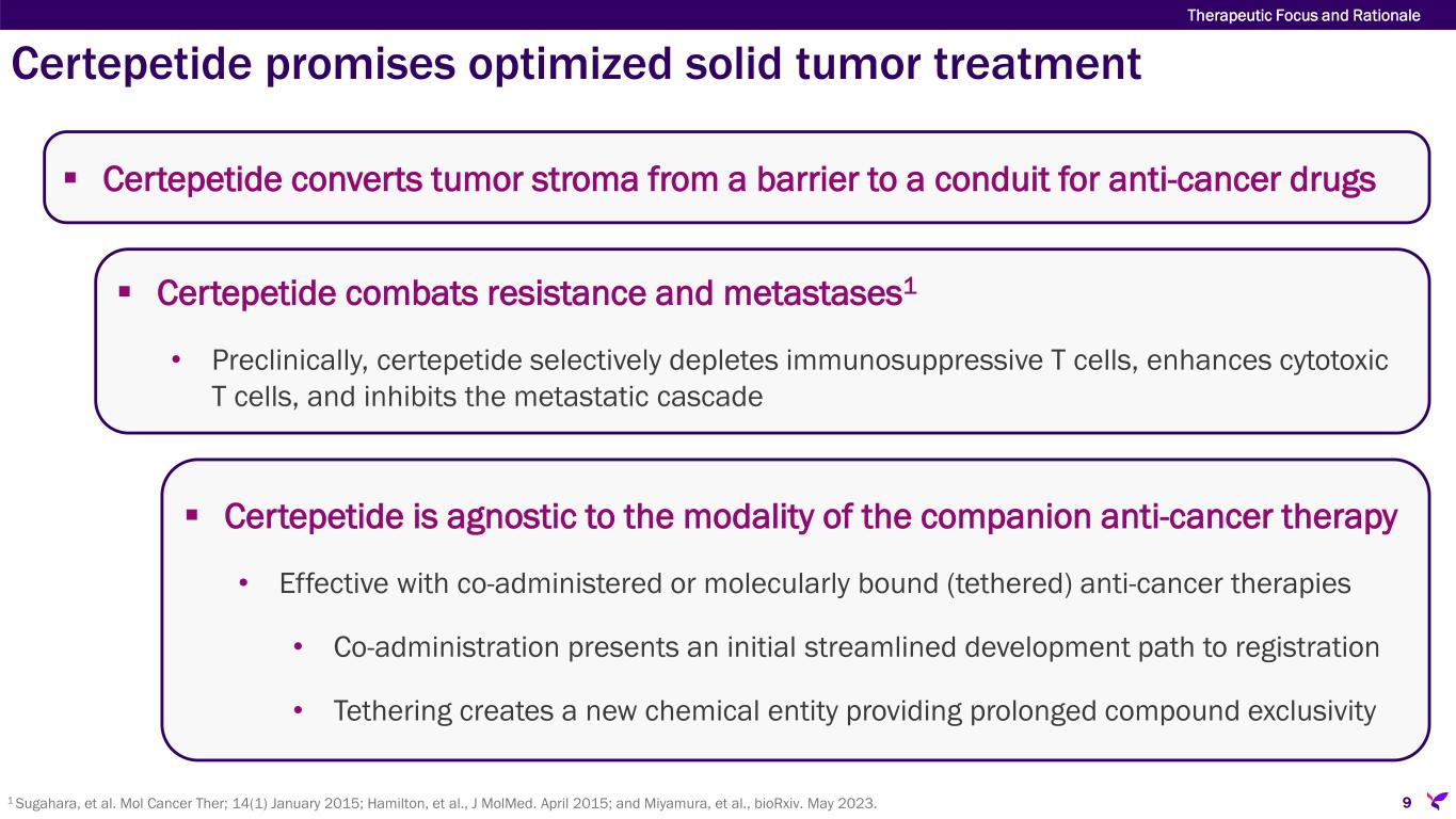 Harnessing the C-end Rule (CendR) transport mechanism for solid tumor penetration Therapeutic Focus and Rationale 8 Improving selective solid tumor penetration to maximize treatment effects  RGD peptides target tumor cells, but do not enhance penetration and delivery  Internalizing RGD (iRGD) peptides combine targeting and penetration enhancement  Certepetide (LSTA1) is an iRGD peptide that triggers the CendR active transport mechanism to selectively target and deliver anti-cancer drugs to solid tumors  Certepetide is in mid- to late-stage clinical development for solid tumor treatment