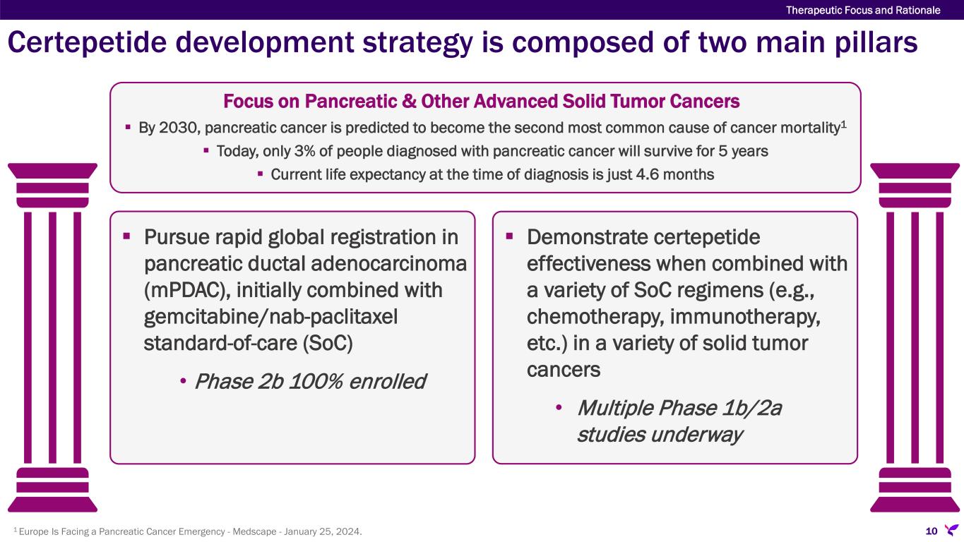 1 Sugahara, et al. Mol Cancer Ther; 14(1) January 2015; Hamilton, et al., J MolMed. April 2015; and Miyamura, et al., bioRxiv. May 2023. Therapeutic Focus and Rationale Certepetide promises optimized solid tumor treatment 9  Certepetide converts tumor stroma from a barrier to a conduit for anti-cancer drugs  Certepetide combats resistance and metastases1 • Preclinically, certepetide selectively depletes immunosuppressive T cells, enhances cytotoxic T cells, and inhibits the metastatic cascade  Certepetide is agnostic to the modality of the companion anti-cancer therapy • Effective with co-administered or molecularly bound (tethered) anti-cancer therapies • Co-administration presents an initial streamlined development path to registration • Tethering creates a new chemical entity providing prolonged compound exclusivity