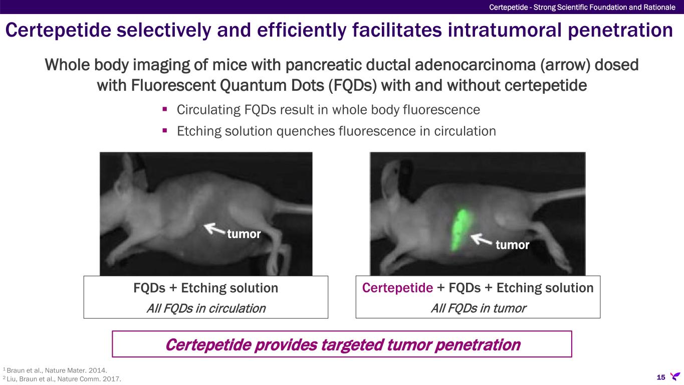 Tumor or Tumor Vascular Endothelial Cell αvβ3 β5 Certepetide (LSTA1) A) Integrin binding Certepetide is a 9 amino acid cyclic peptide with high binding affinity and specificity to αvβ3/β5 integrins that are upregulated on tumor cells and tumor endothelial cells (i.e., tumor stroma) B) Proteolytic cleavage NRP1 Once bound to αvβ3 & β5 integrins, certepetide is cleaved by proteases in the tumor microenvironment (TME) releasing a C-end Rule (CendR) linear peptide fragment αvβ3 β5 C) Neuropilin-1 binding CendR Fragment NRP1 αvβ3 β5 NRP1 The CendR fragment binds with high affinity and specificity to neuropilin-1 (NRP1), an adjacent receptor on the same or nearby cell, activating the CendR transport pathway1 and triggering tumor penetration CendR Fragment D) Transcytosis plus TME modification CendR Transport Mechanism Co-administered anti-cancer drugs  CendR pathway actuation triggers tumor penetration of circulating co-administered anti-cancer drugs  Certepetide-induced TME modification provokes reduction of immunosuppressive T cells, augmentation of cytotoxic T cells, and inhibition of metastases 14 Certepetide - Strong Scientific Foundation and Rationale Certepetide selective tumor targeting & penetration mechanism of action 1 Ding et al., Nature Comm, 2019. Cleavage