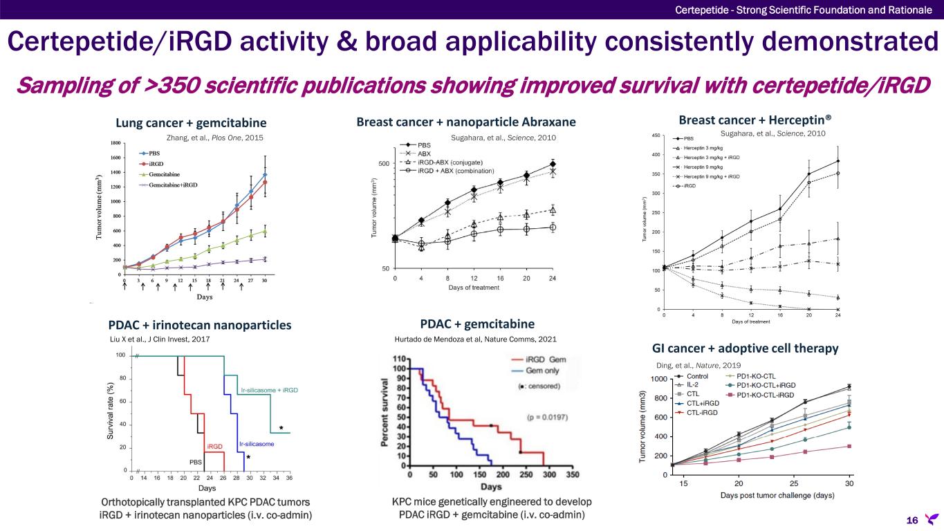 Certepetide selectively and efficiently facilitates intratumoral penetration 1 Braun et al., Nature Mater. 2014. 2 Liu, Braun et al., Nature Comm. 2017. 15 Certepetide - Strong Scientific Foundation and Rationale Whole body imaging of mice with pancreatic ductal adenocarcinoma (arrow) dosed with Fluorescent Quantum Dots (FQDs) with and without certepetide  Circulating FQDs result in whole body fluorescence  Etching solution quenches fluorescence in circulation Certepetide provides targeted tumor penetration tumor tumor FQDs + Etching solution All FQDs in circulation Certepetide + FQDs + Etching solution All FQDs in tumor