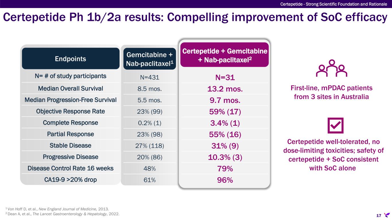 Certepetide/iRGD activity & broad applicability consistently demonstrated Sampling of >350 scientific publications showing improved survival with certepetide/iRGD 16 Breast cancer + Herceptin®Lung cancer + gemcitabine Zhang, et al., Plos One, 2015 Breast cancer + nanoparticle Abraxane GI cancer + adoptive cell therapy Ding, et al., Nature, 2019 PDAC + irinotecan nanoparticles Orthotopically transplanted KPC PDAC tumors iRGD + irinotecan nanoparticles (i.v. co-admin) Liu X et al., J Clin Invest, 2017 PDAC + gemcitabine KPC mice genetically engineered to develop PDAC iRGD + gemcitabine (i.v. co-admin) Hurtado de Mendoza et al, Nature Comms, 2021 Sugahara, et al., Science, 2010Sugahara, et al., Science, 2010 Certepetide - Strong Scientific Foundation and Rationale