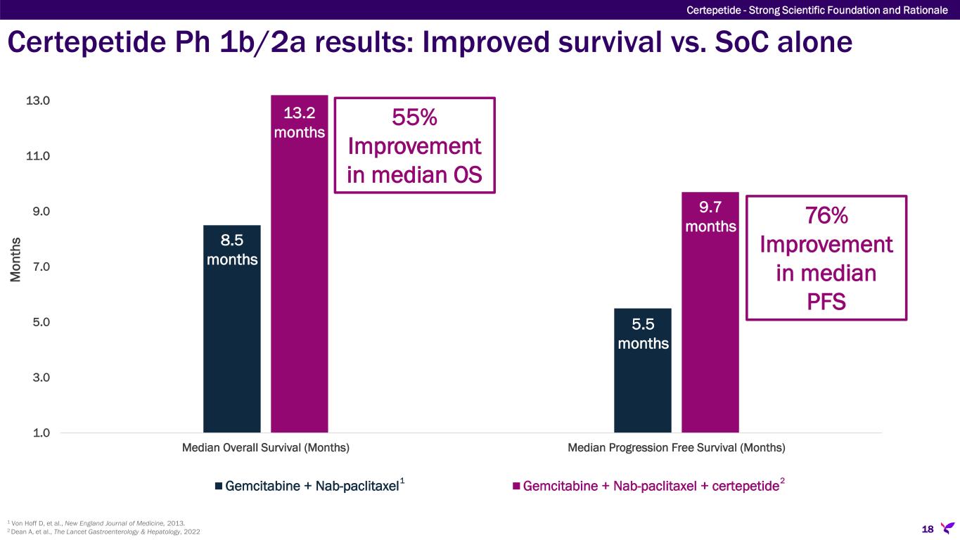 N= # of study participants Median Overall Survival Median Progression-Free Survival Objective Response Rate Complete Response Partial Response Stable Disease Progressive Disease Disease Control Rate 16 weeks CA19-9 >20% drop Gemcitabine + Nab-paclitaxel1 N=431 8.5 mos. 5.5 mos. 23% (99) 0.2% (1) 23% (98) 27% (118) 20% (86) 48% 61% Endpoints 1 Von Hoff D, et al., New England Journal of Medicine, 2013. 2 Dean A, et al., The Lancet Gastroenterology & Hepatology, 2022. N=31 13.2 mos. 9.7 mos. 59% (17) 3.4% (1) 55% (16) 31% (9) 10.3% (3) 79% 96% Certepetide + Gemcitabine + Nab-paclitaxel2 17 Certepetide Ph 1b/2a results: Compelling improvement of SoC efficacy Certepetide well-tolerated, no dose-limiting toxicities; safety of certepetide + SoC consistent with SoC alone First-line, mPDAC patients from 3 sites in Australia Certepetide - Strong Scientific Foundation and Rationale