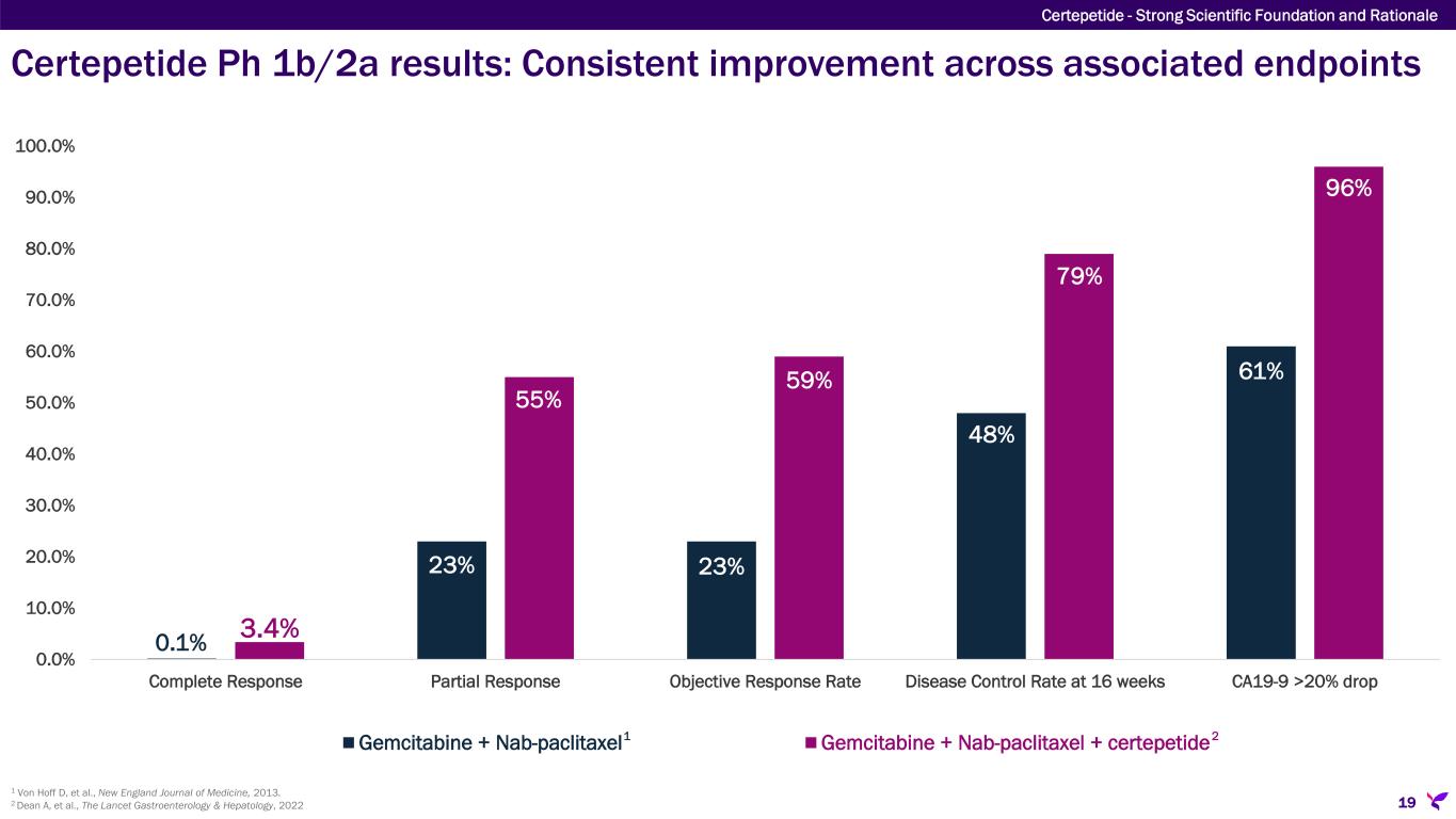 1 Von Hoff D, et al., New England Journal of Medicine, 2013. 2 Dean A, et al., The Lancet Gastroenterology & Hepatology, 2022 1.0 3.0 5.0 7.0 9.0 11.0 13.0 Median Overall Survival (Months) Median Progression Free Survival (Months) M on th s Gemcitabine + Nab-paclitaxel Gemcitabine + Nab-paclitaxel + certepetide 13.2 months 8.5 months 5.5 months 9.7 months 55% Improvement in median OS 76% Improvement in median PFS Certepetide Ph 1b/2a results: Improved survival vs. SoC alone 18 1 2 Certepetide - Strong Scientific Foundation and Rationale
