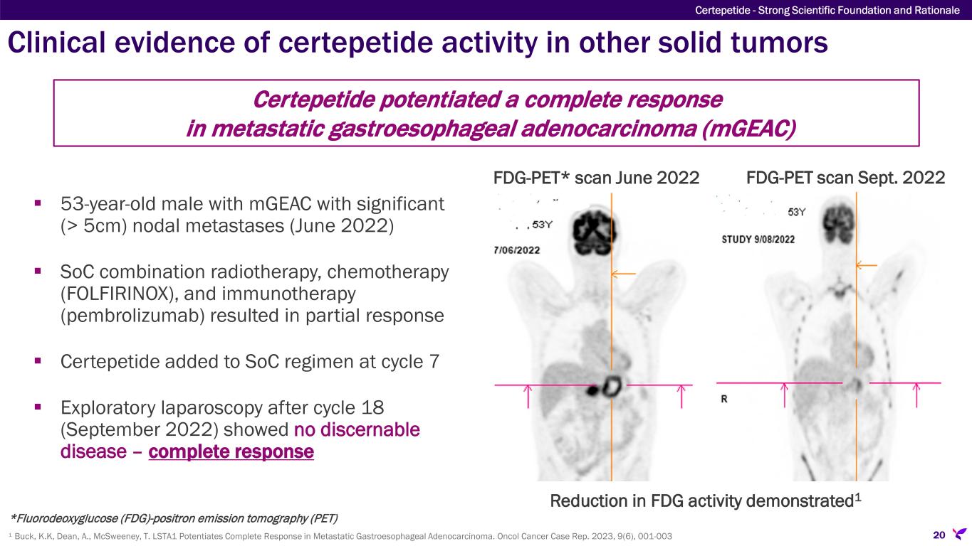 Clinical evidence of certepetide activity in other solid tumors Certepetide potentiated a complete response in metastatic gastroesophageal adenocarcinoma (mGEAC) FDG-PET* scan June 2022 FDG-PET scan Sept. 2022 Reduction in FDG activity demonstrated1  53-year-old male with mGEAC with significant (> 5cm) nodal metastases (June 2022)  SoC combination radiotherapy, chemotherapy (FOLFIRINOX), and immunotherapy (pembrolizumab) resulted in partial response  Certepetide added to SoC regimen at cycle 7  Exploratory laparoscopy after cycle 18 (September 2022) showed no discernable disease – complete response 201 Buck, K.K, Dean, A., McSweeney, T. LSTA1 Potentiates Complete Response in Metastatic Gastroesophageal Adenocarcinoma. Oncol Cancer Case Rep. 2023, 9(6), 001-003 Certepetide - Strong Scientific Foundation and Rationale *Fluorodeoxyglucose (FDG)-positron emission tomography (PET)
